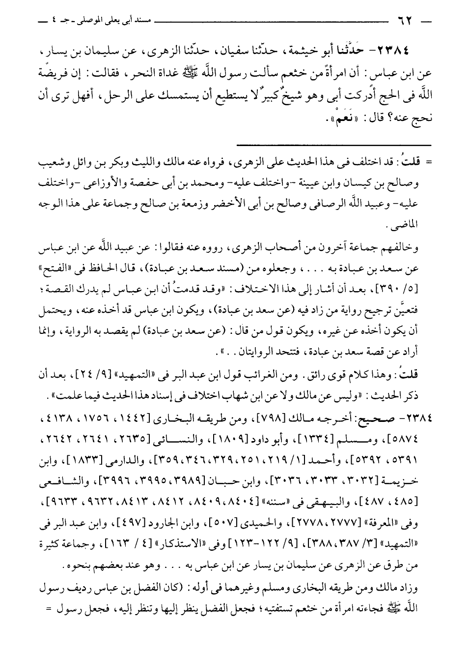 ٢٣٨٤ - حدَّثنا أبو خيثمة، حَدَّثَنَا سفيان، حَدَّثَنَا الزهرى، عن سليمان بن يسارٍ , عن ابن عباسٍ: أن امرأةً من خثعم سألت رسول الله - صلى الله عليه وسلم - غداة النحر، فقالت: إن فريضة الله في الحج أدركت أبى وهو شيخٌ كبيرٌ لا يستطيع أن يستمسك على الرحل، أفهل ترى أن نحج عنه؟ قال: "نَعمْ".