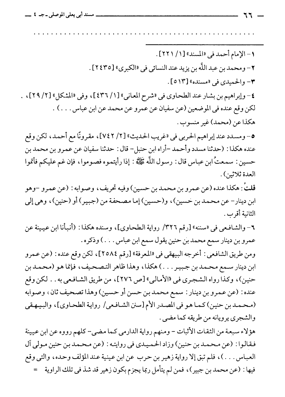 هؤلاء سبعة من الثقات الأثبات - ومنهم رواية الدارمى كما مضى - كلهم رووه عن ابن عيينة فقالوا: (عن محمد بن حنين) وزاد الحميدى في روايته: (عن محمد بن حنين مولى آل العباس ... )، فلم تبق إلا رواية زهير بن حرب عن ابن عينية عند المؤلف وحده، والتى وقع فيها: (عن محمد بن جبير)، فمن لم يتأمل ربما يجزم بكون زهير قد شذ في تلك الراوية =