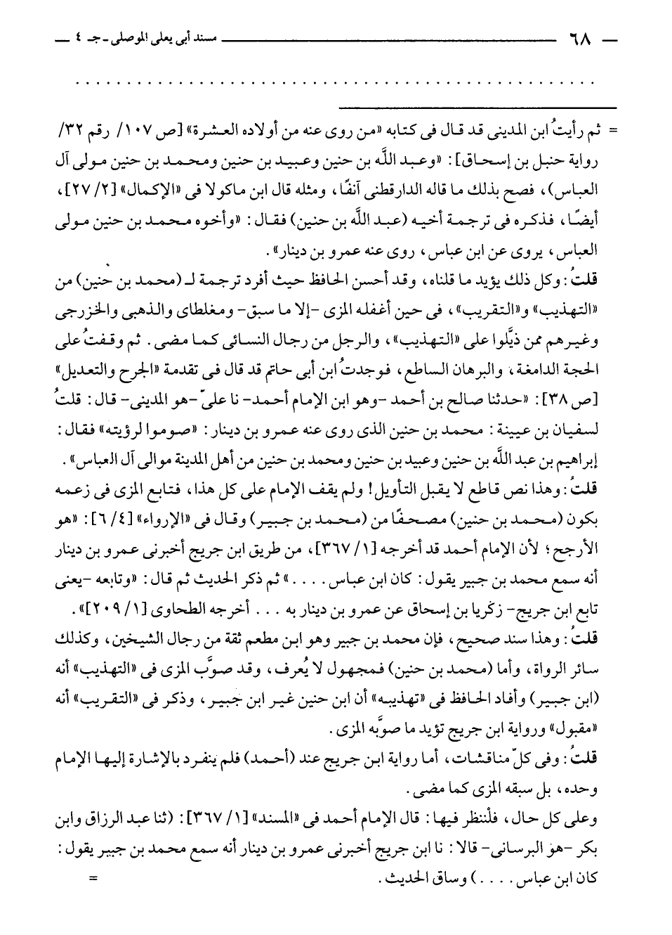 قلتُ: وهذا نص قاطع لا يقبل التأويل! ولم يقف الإمام على كل هذا، فتابع المزى في زعمه بكون (محمد بن حنين) مصحفًا من (محمد بن جبير) وقال في "الإرواء" [٤/ ٦]: "هو الأرجح؛ لأن الإمام أحمد قد أخرجه [١/ ٣٦٧]، من طريق ابن جريج أخبرنى عمرو بن دينار أنه سمع محمد بن جبير يقول: كان ابن عباس .... " ثم ذكر الحديث ثم قال: "وتابعه - يعنى تابع ابن جريج - زكريا بن إسحاق عن عمرو بن دينار به ... أخرجه الطحاوى [١/ ٢٠٩] ".