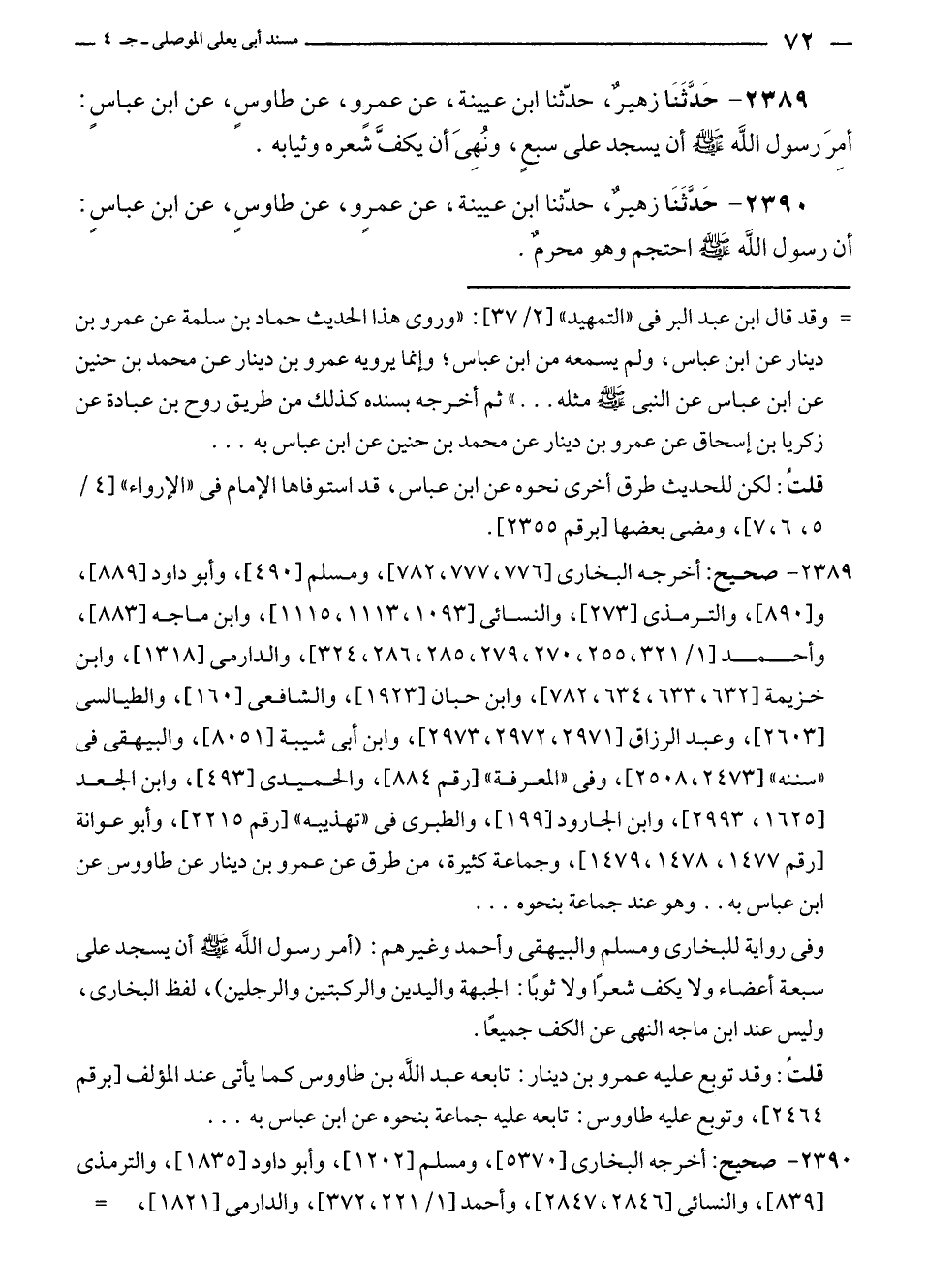 ٢٣٨٩ - حَدَّثَنَا زهيرٌ، حَدَّثَنَا ابن عيينة، عن عمرِو، عن طاوسٍ، عن ابن عباسٍ: أمِرَ رسول الله - صلى الله عليه وسلم - أن يسجد على سبعٍ، ونُهِىَ أن يكفَّ شَعره وثيابه.
