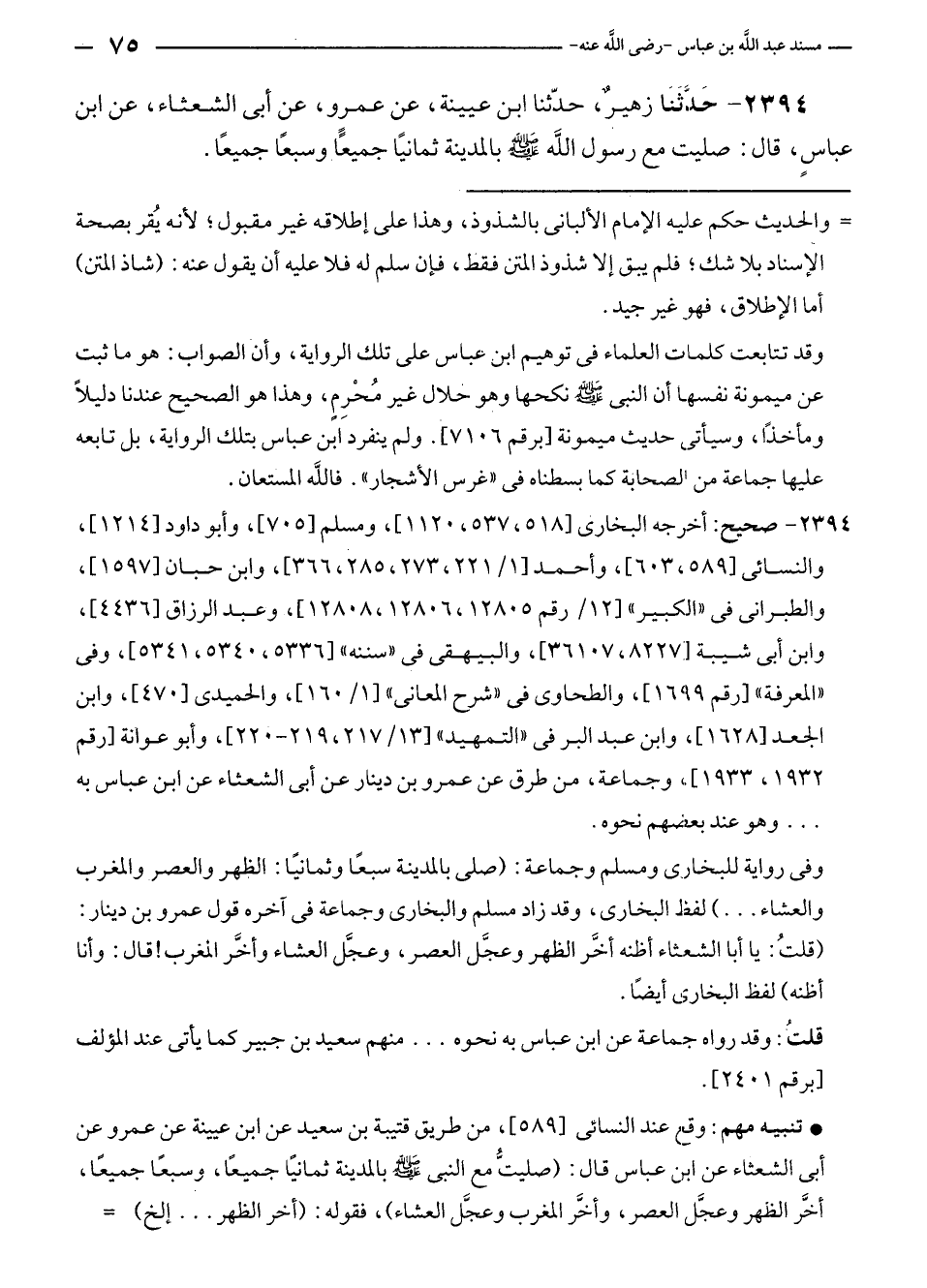 ٢٣٩٤ - حَدَّثَنَا زهير، حَدَّثَنَا ابن عيينة، عن عمرو، عن أبى الشعثاء، عن ابن عباسٍ، قال: صليت مع رسول الله - صلى الله عليه وسلم - بالمدينة ثمانيًا جميعًا وسبعًا جميعًا.