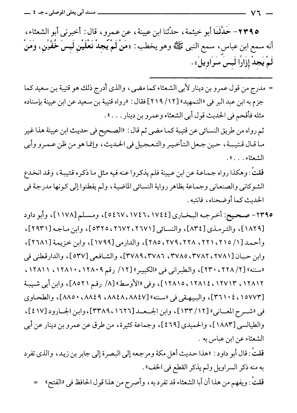 ٢٣٩٥ - حَدَّثَنَا أبو خيثمة، حَدَّثَنَا ابن عيينة، عن عمرٍو، قال: أخبرنى أبو الشعثاء، أنه سمع ابن عباسٍ، سمع النبي - صلى الله عليه وسلم - وهو يخطب: "منْ لَمْ يجِدْ نَعْلَيْنِ لَبِسَ خُفَّيْنٍ، وَمَنْ لَمْ يَجِدْ إِزَارًا لَبِسَ سَرَاوِيلَ".