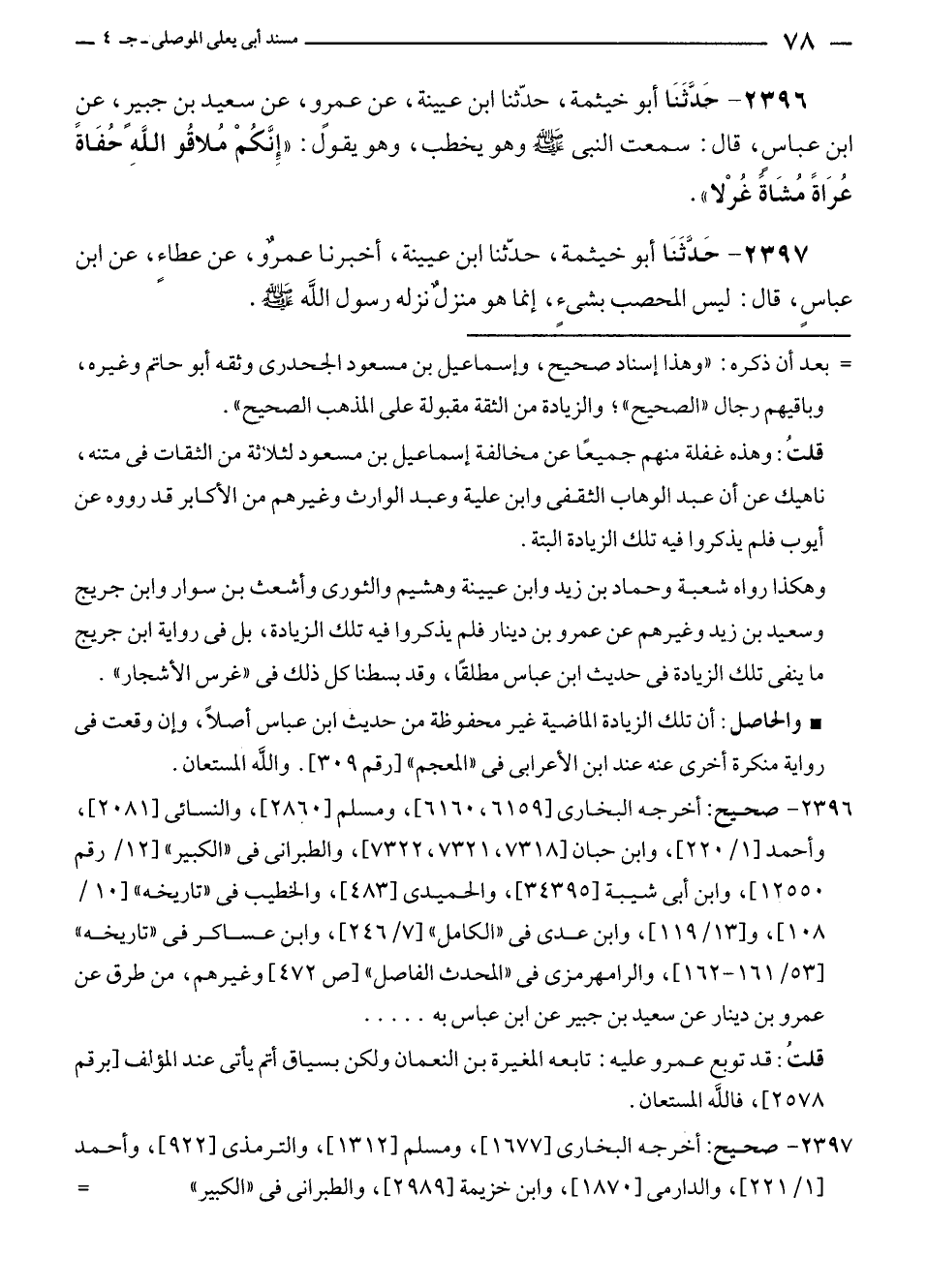 وهكذا رواه شعبة وحماد بن زيد وابن عيينة وهشيم والثورى وأشعث بن سوار وابن جريج وسعيد بن زيد وغيرهم عن عمرو بن دينار فلم يذكروا فيه تلك الزيادة، بل في رواية ابن جريج ما ينفى تلك الزيادة في حديث ابن عباس مطلقًا، وقد بسطنا كل ذلك في "غرس الأشجار".