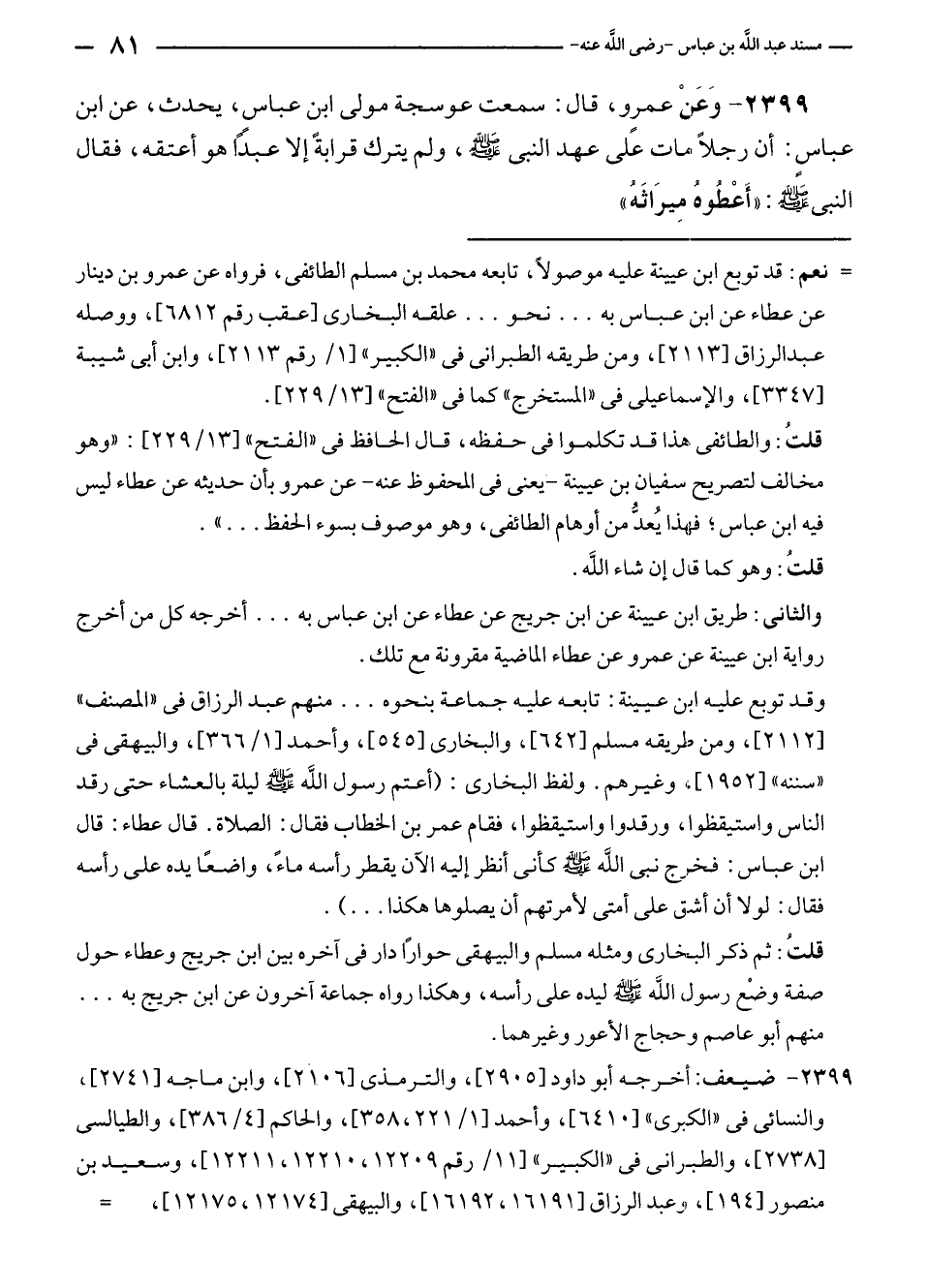 قلتُ: والطائفى هذا قد تكلموا في حفظه، قال الحافظ في "الفتح" [١٣/ ٢٢٩]: "وهو مخالف لتصريح سفيان بن عيينة - يعنى في المحفوظ عنه - عن عمرو برأن حديثه عن عطاء ليس فيه ابن عباس؛ فهذا يُعدُّ من أوهام الطائفى، وهو موصوف بسوء الحفظ ... ".