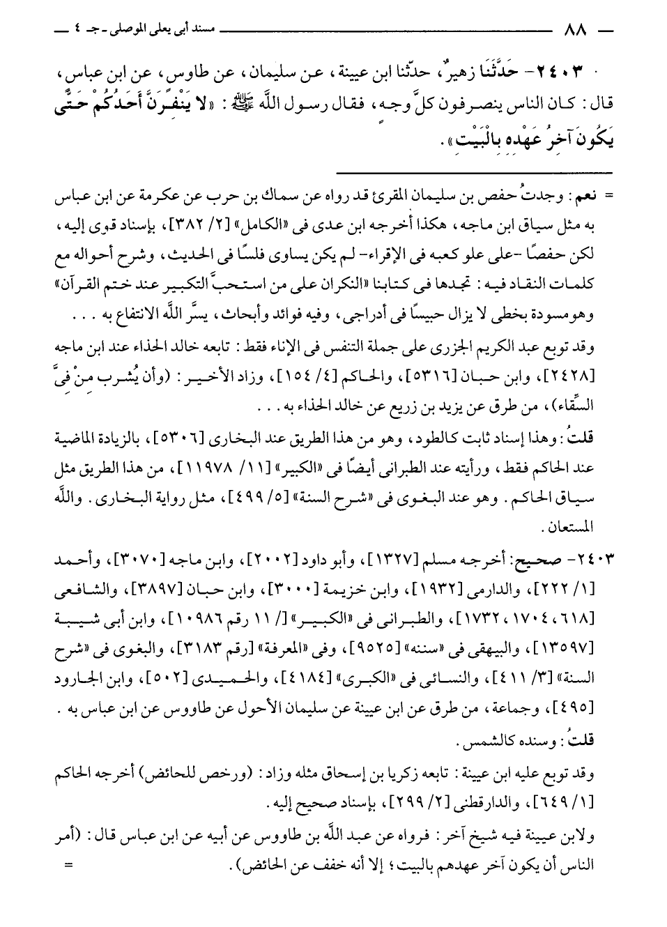 ٢٤٠٣ - صحيح: أخرجه مسلم [١٣٢٧]، وأبو داود [٢٠٠٢]، وابن ماجه [٣٠٧٠]، وأحمد [١/ ٢٢٢]، والدارمى [١٩٣٢]، وابن خزيمة [٣٠٠٠]، وابن حبان [٣٨٩٧]، والشافعى [٦١٨، ١٧٠٤، ١٧٣٢]، والطبرانى في "الكبير" [١/ ١١ رقم ١٠٩٨٦]، وابن أبى شيبة [١٣٥٩٧]، والبيهقى في "سننه" [٩٥٢٥]، وفى "المعرفة" [رقم ٣١٨٣]، والبغوى في "شرح السنة" [٣/ ٤١١]، والنسائى في "الكبرى" [٤١٨٤]، والحميدى [٥٠٢]، وابن الجارود [٤٩٥]، وجماعة، من طرق عن ابن عيينة عن سليمان الأحول عن طاووس عن ابن عباس به.