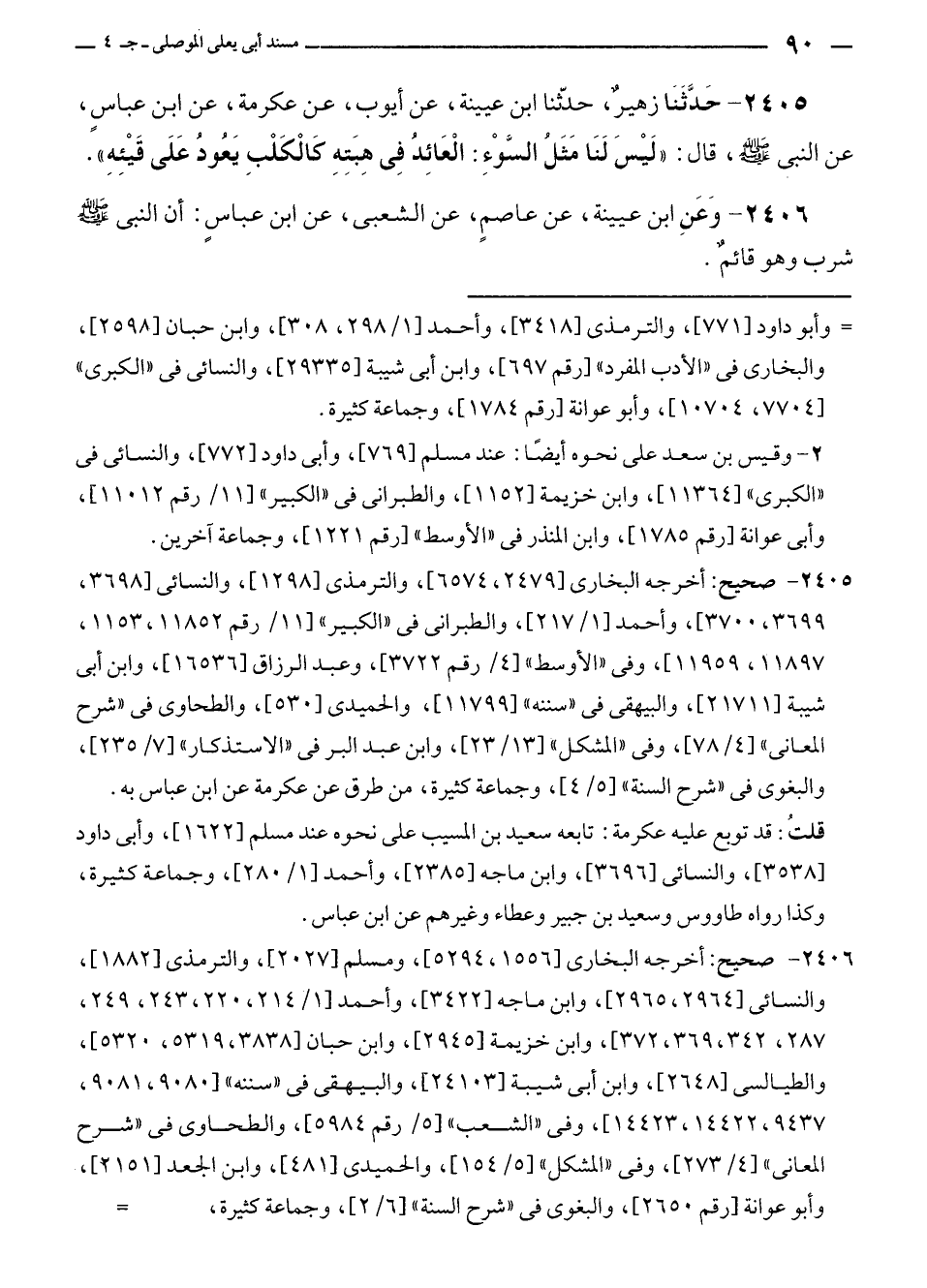 ٢٤٠٦ - وَعَنِ ابن عيينة، عن عاصمٍ، عن الشعبى، عن ابن عباسٍ: أن النبي - صلى الله عليه وسلم - شرب وهو قائمٌ.
