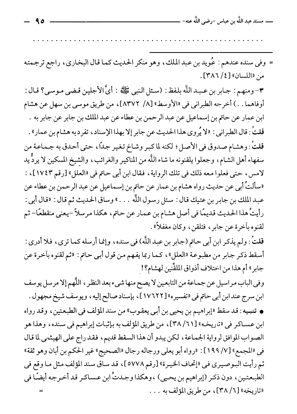 قلتُ: ولم يذكر ابن أبى حاتم (جابر بن عبد الله) في سنده، وإنما أرسله كما ترى، فلا أدرى: أسقط ذكر جابر من مطبوعة "العلل"، كما ربما يفهم من قول أبى حاتم: "ثم لقنوه بآخرة عن جابر" أم هذا من اختلاف أذواق الملقِّنين لهشام؟!