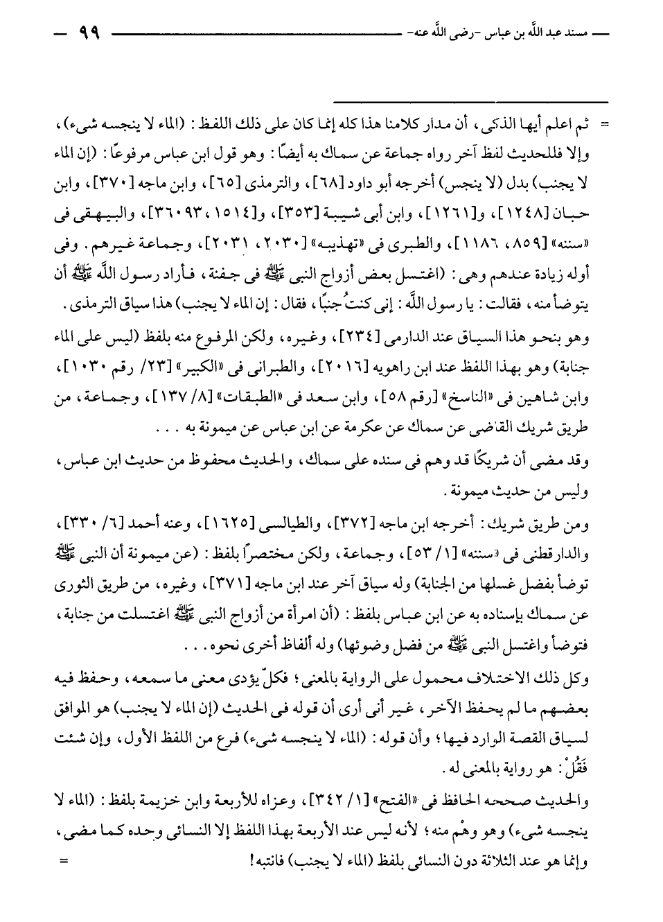 = ثم اعلم أيها الذكي، أن مدار كلامنا هذا كله إنما كان على ذلك اللفظ: (الماء لا ينجسه شئ)، وإلا فللحديث لفظ آخر رواه جماعة عن سماك به أيضًا: وهو قول ابن عباس مرفوعًا: (إن الماء لا يجنب) بدل (لا ينجس) أخرجه أبو داود [٦٨]، والترمذى [٦٥]، وابن ماجة [٣٧٠]، وابن حبان [١٢٤٨]، و [١٢٦١]، وابن أبى شيبة [٣٥٣١]، و [١٥١٤، ٣٦٠٩٣]، والبيهقى في "سننه" [٥٩١٨، ١١٨٦]، والطبرى في "تهذيبه" [٢٠٣٠، ٢٠٣١]، وجماعة غيرهم. وفى أوله زيادة عندهم وهى: (اغتسل بعض أزواج النبي - صلى الله عليه وسلم - في جفنة، فأراد رسول الله - صلى الله عليه وسلم - أن يتوضأ منه، فقالت: يا رسول الله: إنى كنتُ جنبًا، فقال: إن الماء لا يجنب) هذا سياق الترمذى.