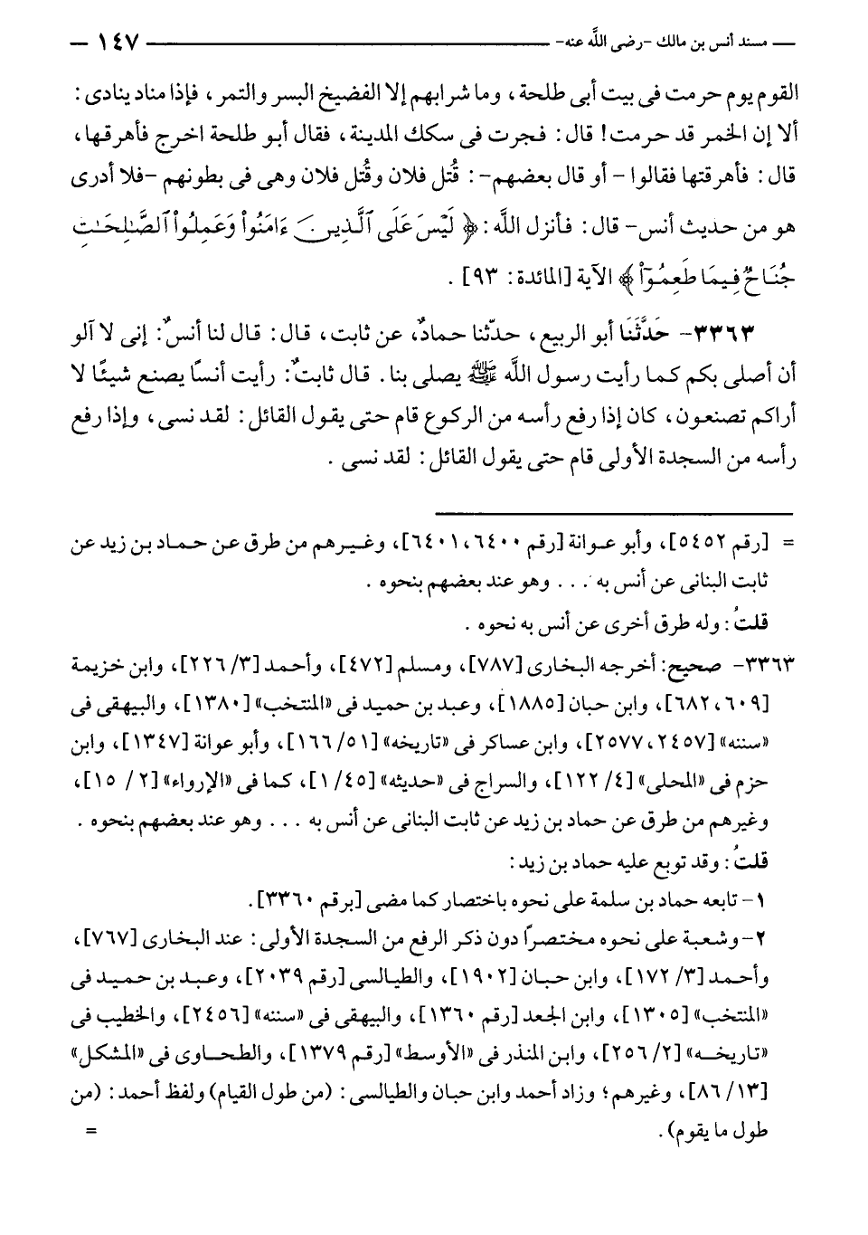 ٣٣٦٣ - حَدَّثَنَا أبو الربيع، حدّثنا حمادٌ، عن ثابت، قال: قال لنا أنسٌ: إنى لا آلو أن أصلى بكم كما رأيت رسول الله - صلى الله عليه وسلم - يصلى بنا. قال ثابتٌ: رأيت أنسًا يصنع شيئًا لا أراكم تصنعون، كان إذا رفع رأسه من الركوع قام حتى يقول القائل: لقد نسى، وإذا رفع رأسه من السجدة الأولى قام حتى يقول القائل: لقد نسى.
