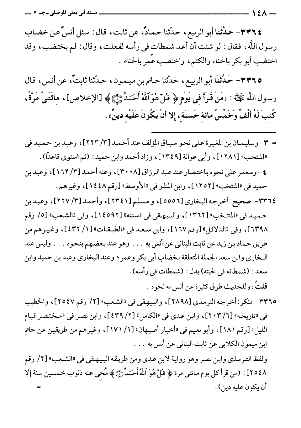 ٣٣٦٥ - حَدَّثَنَا أبو الربيع، حدّثنا حاتم بن ميمون، حدّثنا ثابتٌ، عن أنس، قال رسول الله - صلى الله عليه وسلم -: "مَنْ قَرَأَ في يَوْمٍ {قُلْ هُوَ اللَّهُ أَحَدٌ (١)} [الإخلاص: ١]، مِائَتَىْ مَرَّةً، كتِبَ لَه أَلْفٌ وَخَمْسُ مِائَةِ حَسَنَةٍ، إلا أَنْ يَكُونَ عَلَيْهِ دِينٌ".