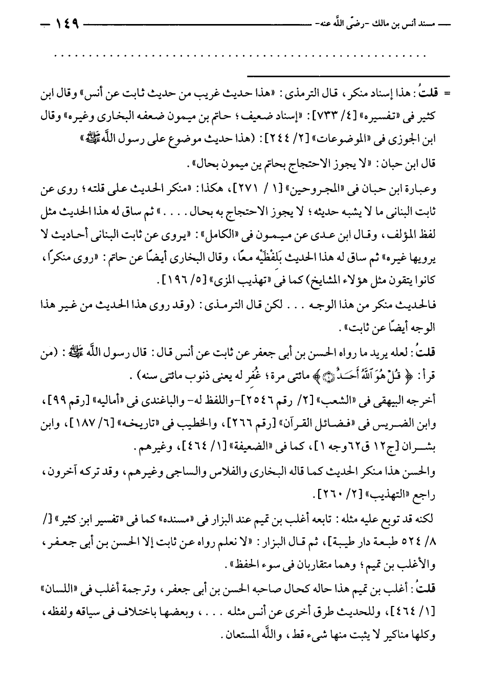 قلتُ: لعله يريد ما رواه الحسن بن أبى جعفر عن ثابت عن أنس قال: قال رسول الله - صلى الله عليه وسلم -: (من قرأ: {قُلْ هُوَ اللَّهُ أَحَدٌ (١)} مائتى مرة؛ غُفِر له يعنى ذنوب مائتى سنة).