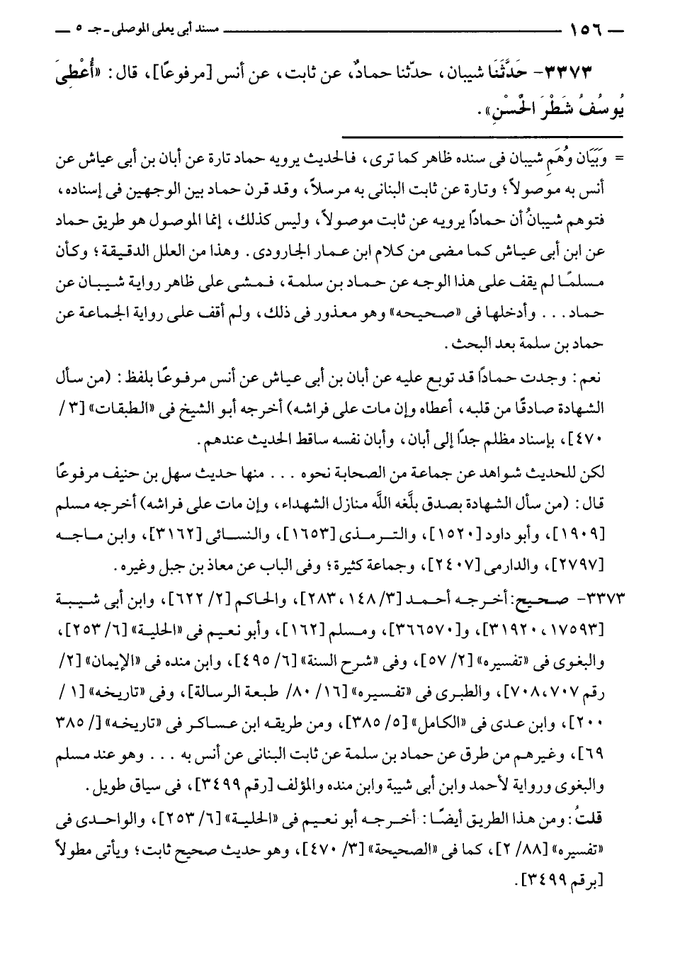 ٣٣٧٣ - حَدَّثَنَا شيبان، حدّثنا حماد، عن ثابت، عن أنس [مرفوعًا]، قال: "أُعْطِىَ يُوسُفُ شَطْرَ الحسْنِ".