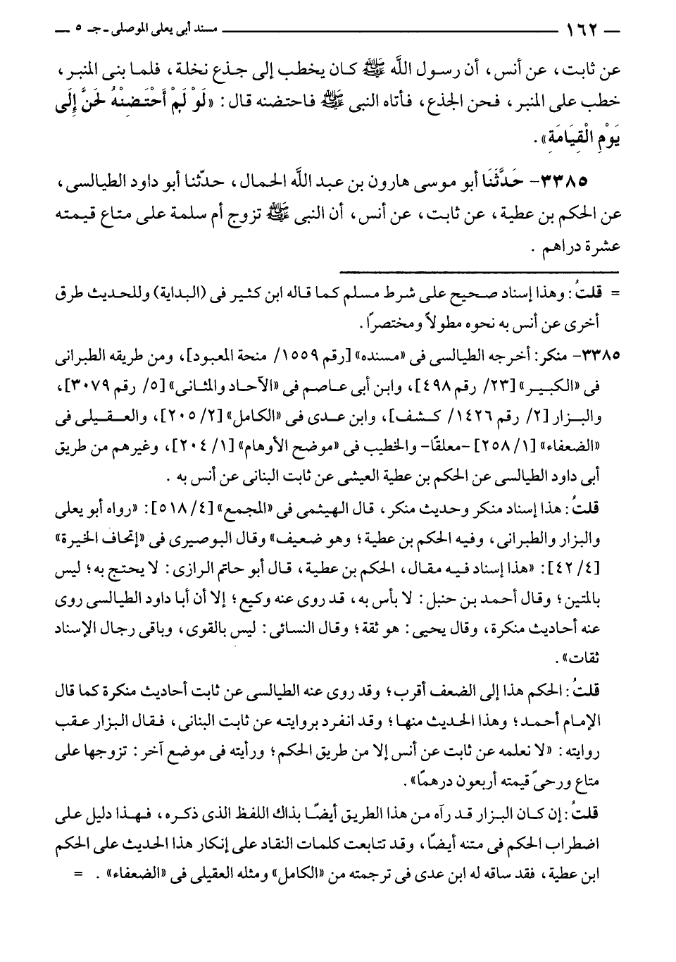 ٣٣٨٥ - منكر: أخرجه الطيالسى في "مسنده" [رقم ١٥٥٩/ منحة المعبود]، ومن طريقه الطبراني في "الكبير" [٢٣/ رقم ٤٩٨]، وابن أبى عاصم في "الآحاد والمثانى" [٥/ رقم ٣٠٧٩]، والبزار [٢/ رقم ١٤٢٦/ كشف]، وابن عدى في "الكامل" [٢/ ٢٠٥]، والعقيلى في "الضعفاء" [١/ ٢٥٨]- معلقًا - والخطيب في "موضح الأوهام" [١/ ٢٠٤]، وغيرهم من طريق أبى داود الطيالسى عن الحكم بن عطية العيشى عن ثابت البنانى عن أنس به.