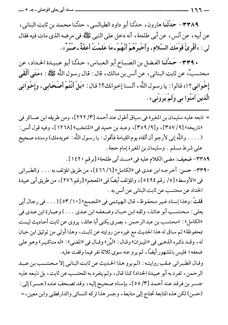 ٣٣٨٩ - حَدَّثَنَا هارون، حدّثنا أبو داود الطيالسى، حدّثنا محمد بن ثابت البنانى، عن أبيه، عن أنس، عن أبى طلحة، أنه دخل على النبي - صلى الله عليه وسلم - في مرضه الذي مات فيه فقال لى: "أَقْرِئْ قَوْمَكَ السَّلامَ، وَأَخْبِرْهُمْ أَنَّهُمْ - مَا عَلِمْتُ أَعِفَّةٌ - صُبُرٌ".