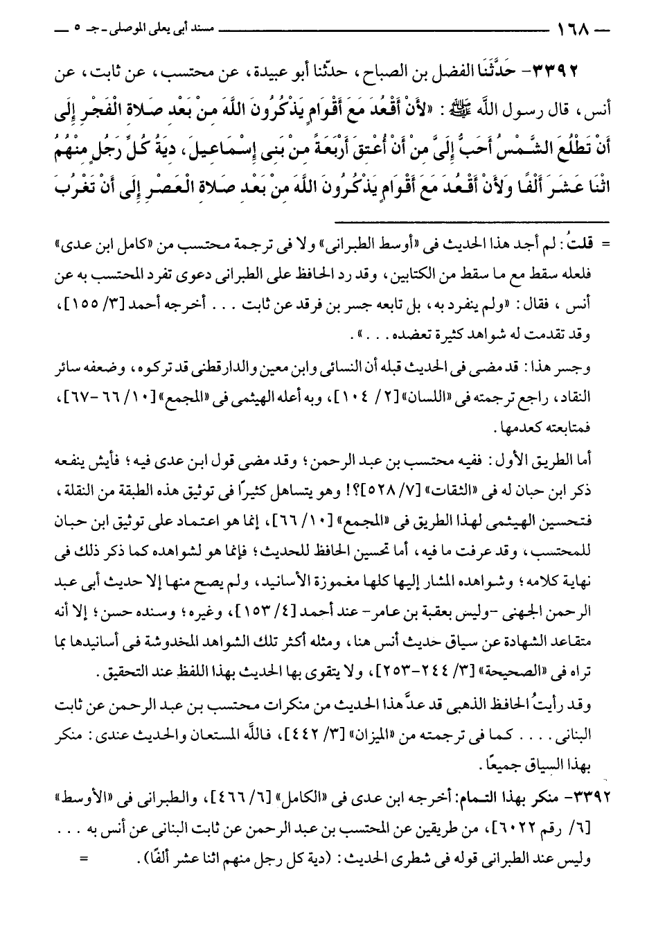 ٣٣٩٢ - حَدَّثَنَا الفضل بن الصباح، حدّثنا أبو عبيدة، عن محتسب، عن ثابت، عن أنس، قال رسول الله - صلى الله عليه وسلم -: "لأَنْ أَقْعُدَ مَعَ أَقْوَامٍ يَذْكرُونَ اللهَ مِنْ بَعْدِ صَلاةِ الْفَجْرِ إلَى أَنْ تَطْلُعَ الشَّمْسُ أَحَبُّ إلَيَّ مِنْ أَنْ أُعْتِقَ أَرْبَعَةً مِنْ بَنِى إسمَاعِيلَ، دِيَةُ كُلِّ رَجُلٍ مِنْهُمُ اثْنَا عَشَرَ أَلْفًا وَلأَنْ أَقْعُدَ مَعَ أَقْوَامٍ يَذْكُرُونَ اللهَ مِنْ بَعْدِ صَلاةِ الْعَصْرِ إلَى أَنْ تَغْرُبَ