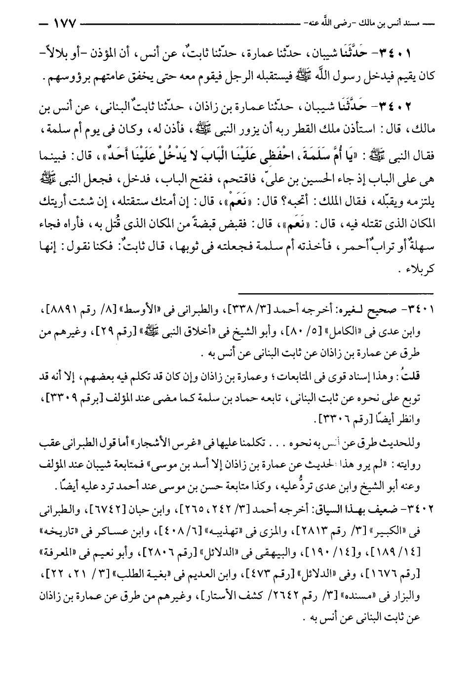 ٣٤٠٢ - حَدَّثَنَا شيبان، حدّثنا عمارة بن زاذان، حدّثنا ثابتٌ البنانى، عن أنس بن مالك، قال: استأذن ملك القطر ربه أن يزور النبي - صلى الله عليه وسلم -، فأذن له، وكان في يوم أم سلمة، فقال النبي - صلى الله عليه وسلم -: "يَا أُمَّ سَلَمَةَ، احْفَظِى عَلَيْنَا الْبَابَ لا يَدْخُلْ عَلَيْنَا أَحَدٌ"، قال: فبينما هي على الباب إذ جاء الحسين بن عليّ، فاقتحم، ففتح الباب، فدخل، فجعل النبي - صلى الله عليه وسلم - يلتزمه ويقبّله، فقال الملك: أتحبه؟ قال: "نَعَمْ"، قال: إن أمتك ستقتله، إن شئت أريتك المكان الذي تقتله فيه، قال: "نَعَم"، قال: فقبض قبضةً من المكان الذي قُتل به، فأراه فجاء سهلةٌ أو ترابٌ أحمر، فأخذته أم سلمة فجعلته في ثوبها، قال ثابتٌ: فكنا نقول: إنها كربلاء.