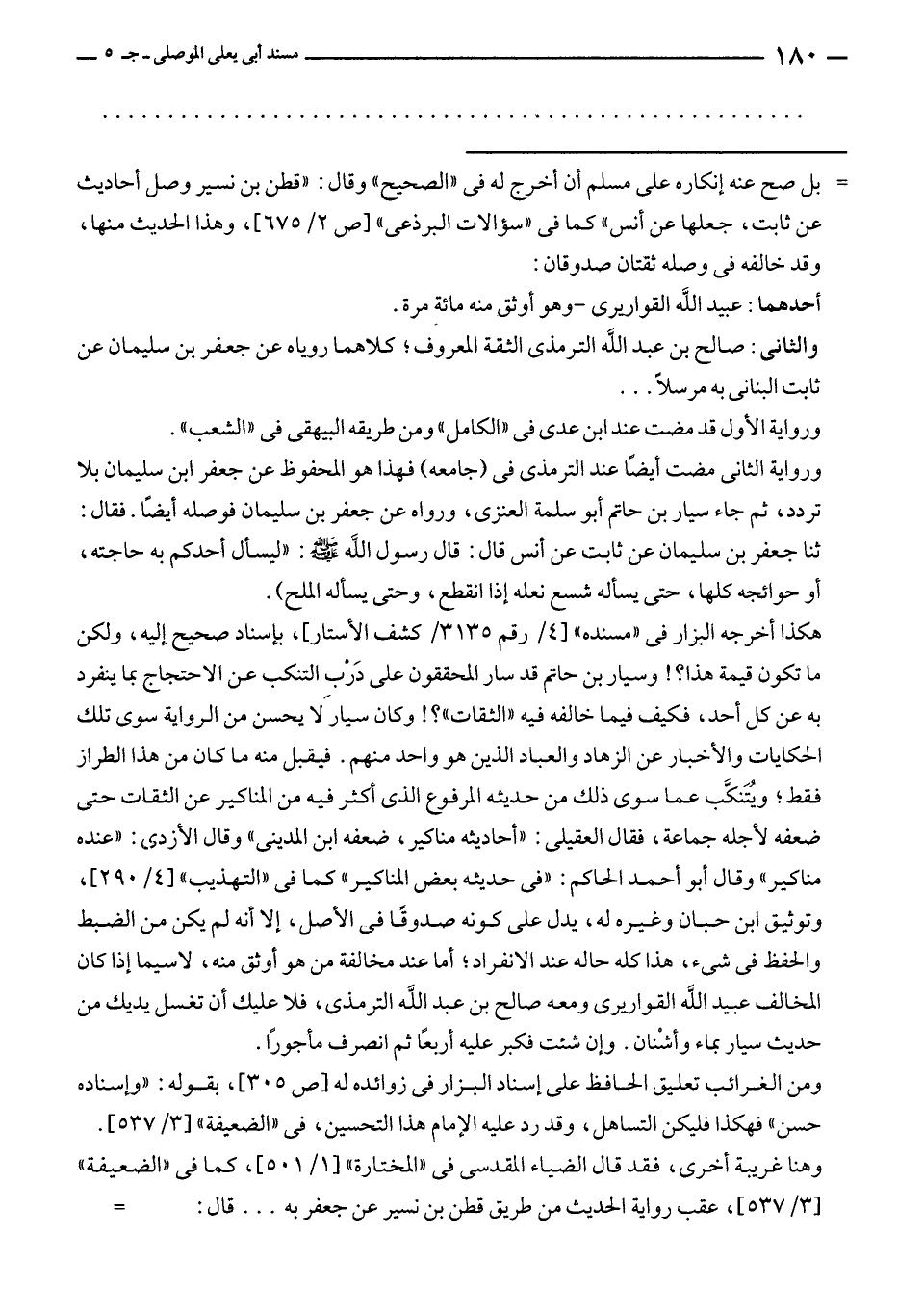ورواية الثاني مضت أيضًا عند الترمذى في (جامعه) فهذا هو المحفوظ عن جعفر بن سليمان بلا تردد، ثم جاء سيار بن حاتم أبو سلمة العنزى، ورواه عن جعفر بن سليمان فوصله أيضًا. فقال: ثنا جعفر بن سليمان عن ثابت عن أنس قال: قال رسول الله - صلى الله عليه وسلم -: "ليسأل أحدكم به حاجته، أو حوائجه كلها، حتى يسأله شسع نعله إذا انقطع، وحتى يسأله الملح).