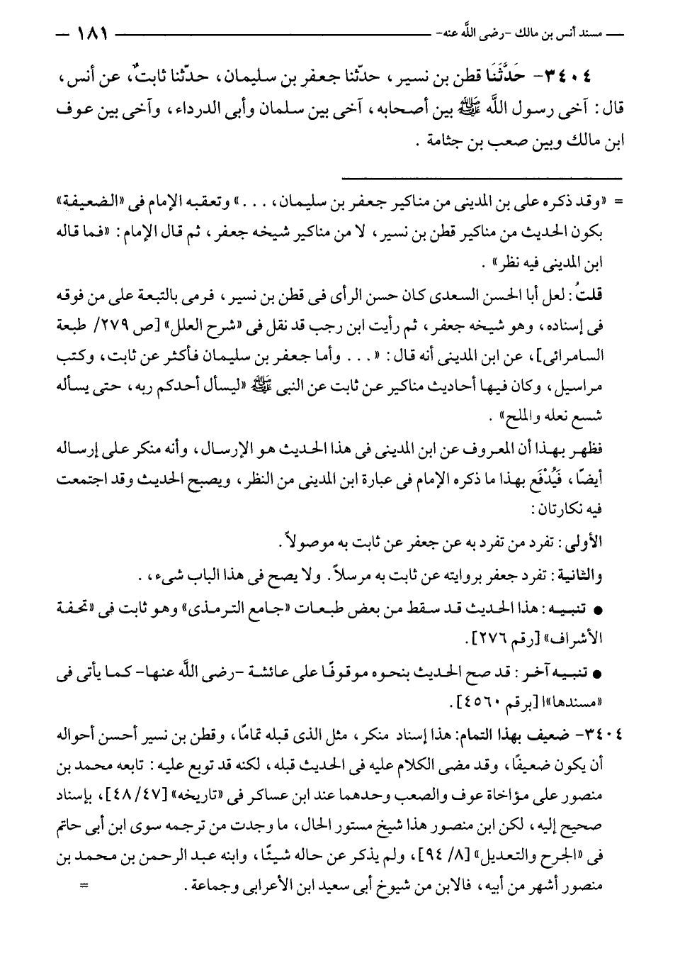 = "وقد ذكره على بن المدينى من مناكير جعفر بن سليمان، ... " وتعقبه الإمام في "الضعيفة" بكون الحديث من مناكير قطن بن نسير، لا من مناكير شيخه جعفر، ثم قال الإمام: "فما قاله ابن المدينى فيه نظر".