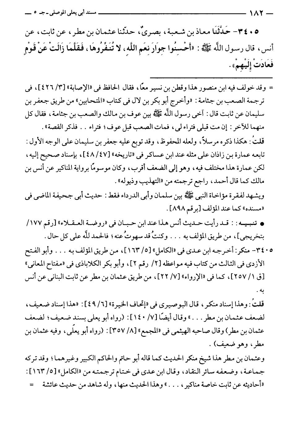 قلتُ: وهذا إسناد منكر، قال البوصيرى في "إتحاف الخيرة" [٦/ ٤٩]: "هذا إسناد ضعيف، لضعف عثمان بن مطر ... " وقال أيضًا [٧/ ١٤٠]: (رواه أبو يعلى بسند ضعيف؛ لضعف عثمان بن مطر) وقال صاحبه الهيثمى في "المجمع" [٨/ ٣٥٧]: (رواه أبو يعلى، وفيه عثمان بن مطر، وهو ضعيف).