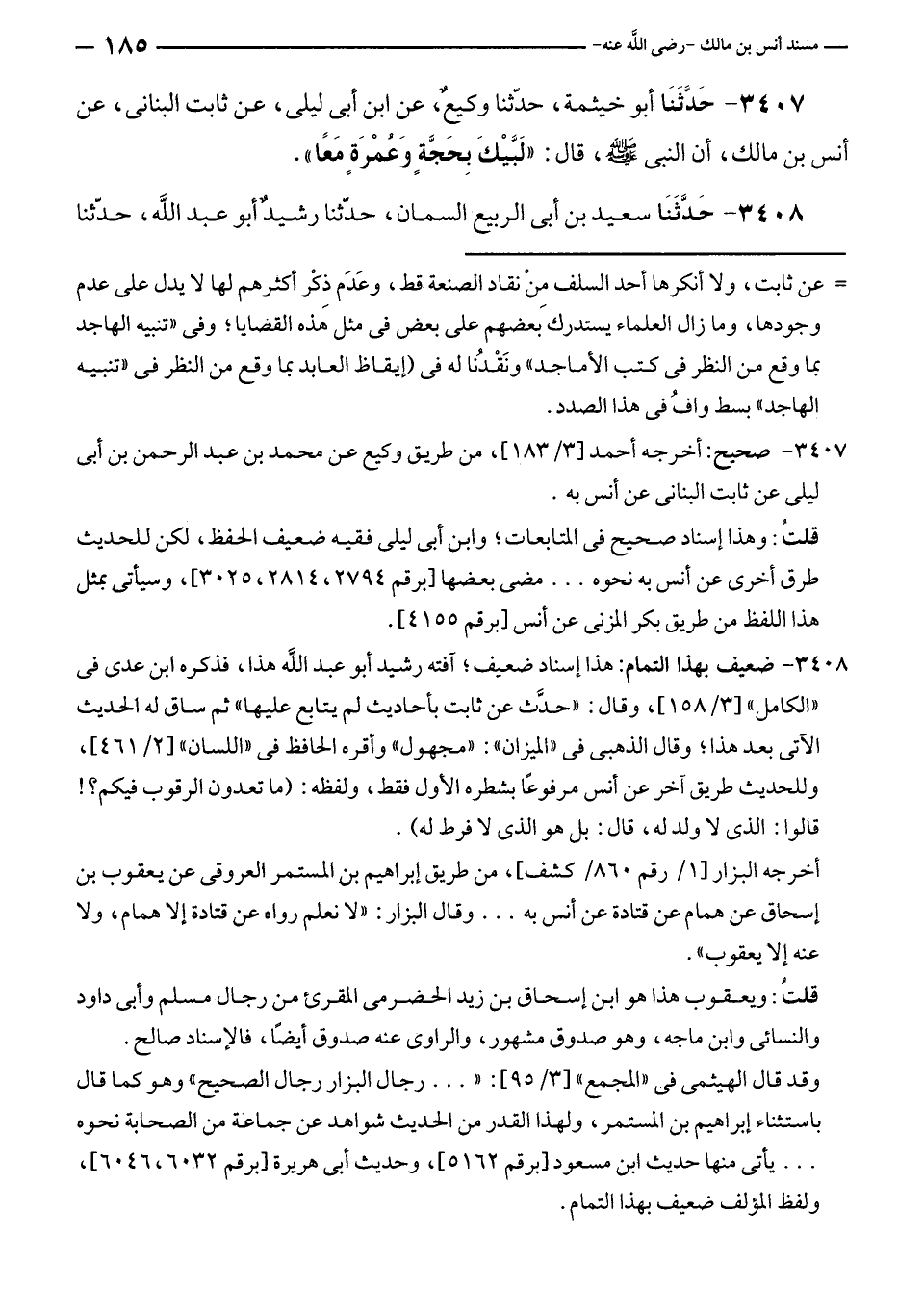 ٣٤٠٧ - حَدَّثَنَا أبو خيثمة، حدّثنا وكيعٌ، عن ابن أبى ليلى، عن ثابت البنانى، عن أنس بن مالك، أن النبي - صلى الله عليه وسلم -، قال: "لَبَّيْكَ بِحَجَّةٍ وَعُمْرَةٍ مَعًا".