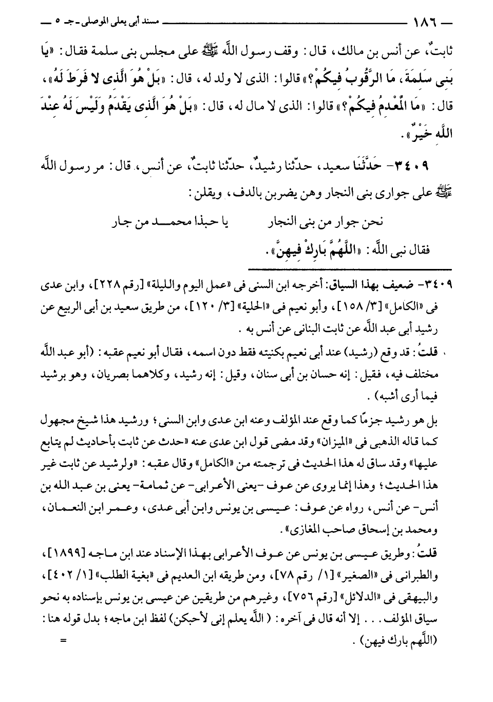 ٣٤٠٩ - حَدَّثَنَا سعيد، حدّثنا رشيدٌ، حدّثنا ثابتٌ، عن أنس، قال: مر رسول الله - صلى الله عليه وسلم - على جوارى بنى النجار وهن يضربن بالدف، ويقلن: