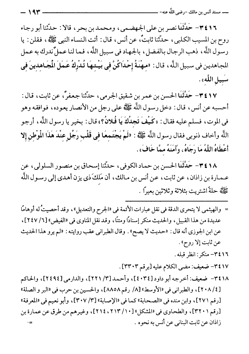 = والهيثمى لا يتحرى الدقة في نقل عبارات الأئمة في "الجرح والتعديل"، وقد أحصيتُ له أوهامًا عديدة من هذا القبيل، والحديث منكر إسنادًا ومتنًا، وقد نقل المناوى في "الفيض" [٦/ ٢٤٧]، عن ابن الجوزى أنه قال: "حديث لا يصح". وقال الطبراني عقب روايته: "لم يرو هذا الحديث عن ثابت إلا روح".