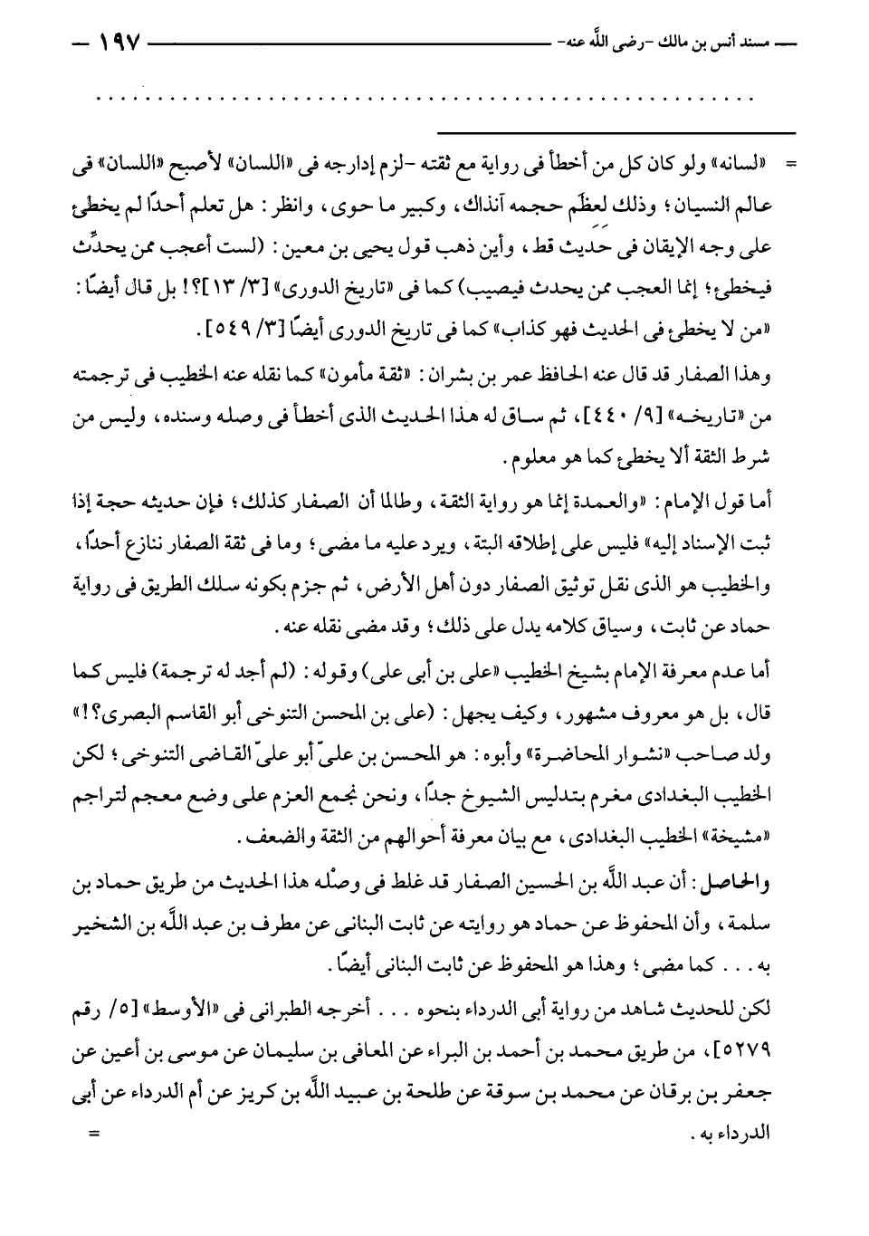 أما قول الإمام: "والعمدة إنما هو رواية الثقة، وطالما أن الصفار كذلك؛ فإن حديثه حجة إذا ثبت الإسناد إليه" فليس على إطلاقه البتة، ويرد عليه ما مضى؛ وما في ثقة الصفار ننازع أحدًا، والخطيب هو الذي نقل توثيق الصفار دون أهل الأرض، ثم جزم بكونه سلك الطريق في رواية حماد عن ثابت، وسياق كلامه يدل على ذلك؛ وقد مضى نقله عنه.