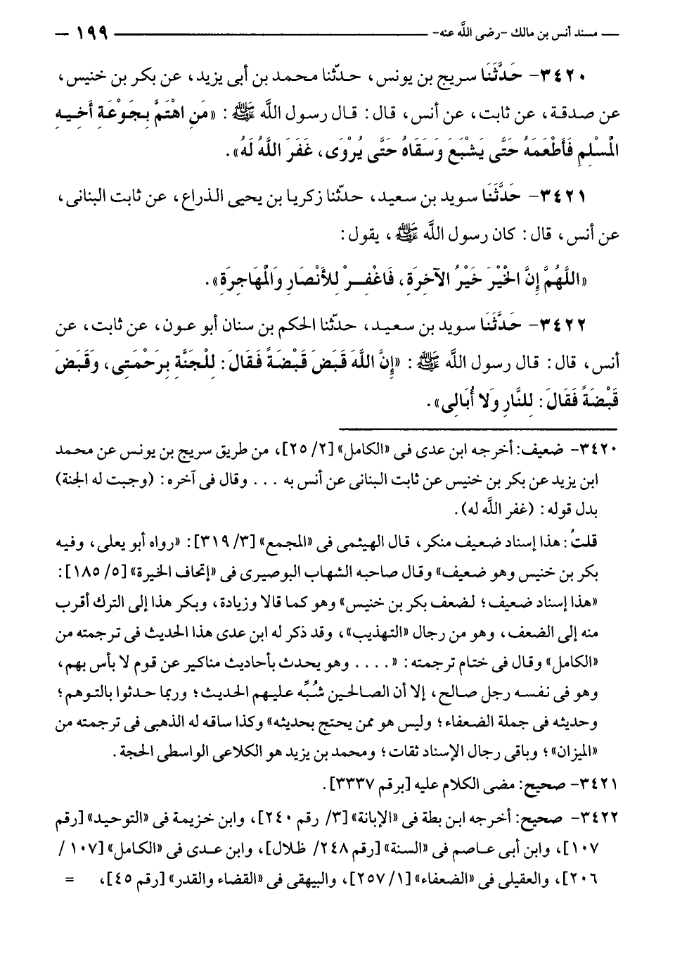 ٣٤٢٠ - حَدَّثَنَا سريج بن يونس، حدّثنا محمد بن أبى يزيد، عن بكر بن خنيس، عن صدقة، عن ثابت، عن أنس، قال: قال رسول الله - صلى الله عليه وسلم -: "مَنِ اهْتَمَّ بِجَوْعَةِ أَخِيهِ المسْلِمِ فَأَطْعَمَهُ حَتَّى يَشْبَعَ وَسَقَاهُ حَتَّى يُرْوَى، غَفَرَ اللَّهُ لَهُ".