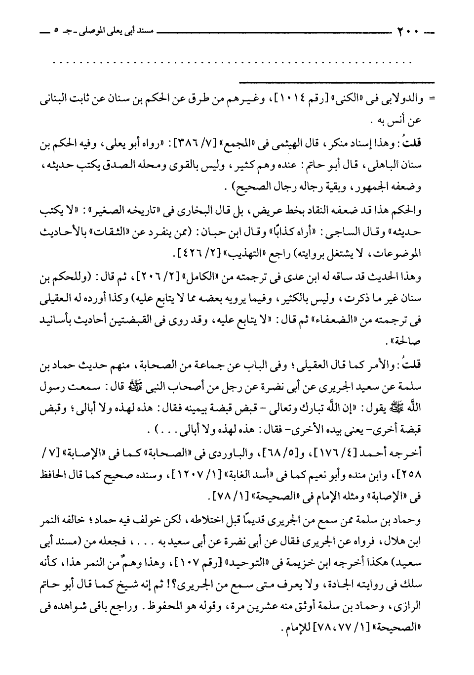 وحماد بن سلمة ممن سمع من الجريرى قديمًا قبل اختلاطه، لكن خولف فيه حماد؛ خالفه النمر بن هلال، فرواه عن الجريرى فقال عن أبى نضرة عن أبى سعيد به ... ، فجعله من (مسند أبى سعيد) هكذا أخرجه ابن خزيمة في "التوحيد" [رقم ١٠٧]، وهذا وهمٌ من النمر هذا، كأنه سلك في روايته الجادة، ولا يعرف متى سمع من الجريرى؟! ثم إنه شيخ كما قال أبو حاتم الرازى، وحماد بن سلمة أوثق منه عشرين مرة، وقوله هو المحفوظ. وراجع باقى شواهده في "الصحيحة" [١/ ٧٧، ٧٨] للإمام.