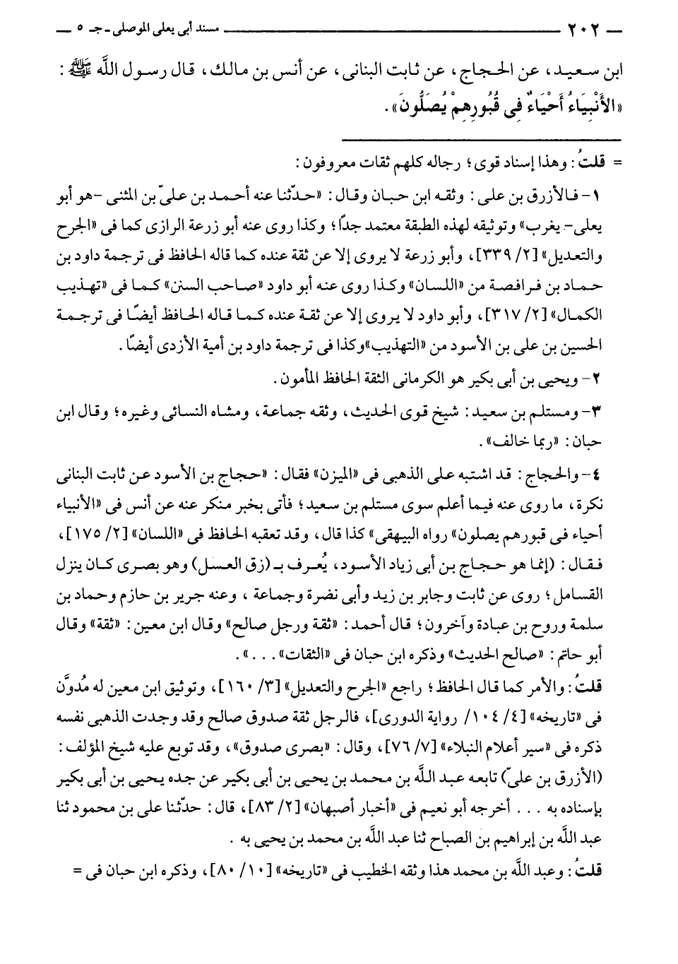 ابن سعيد، عن الحجاج، عن ثابت البنانى، عن أنس بن مالك، قال رسول الله - صلى الله عليه وسلم -: "الأَنْبِيَاءُ أَحْيَاءٌ في قُبُورِهِمْ يُصَلُّونَ".