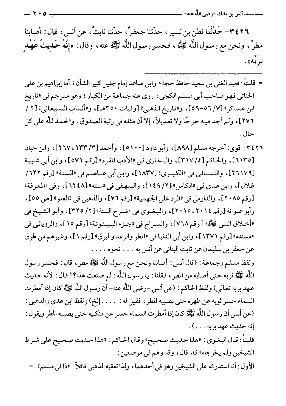 ٣٤٢٦ - حَدَّثَنَا قطن بن نسير، حدّثنا جعفرٌ، حدّثنا ثابتٌ، عن أنس، قال: أصابنا مطرٌ، ونحن مع رسول الله - صلى الله عليه وسلم -، فحسر رسول الله - صلى الله عليه وسلم - عنه، وقال: "إنهُ حَدِيثُ عَهْدٍ بِرَبِّهِ".
