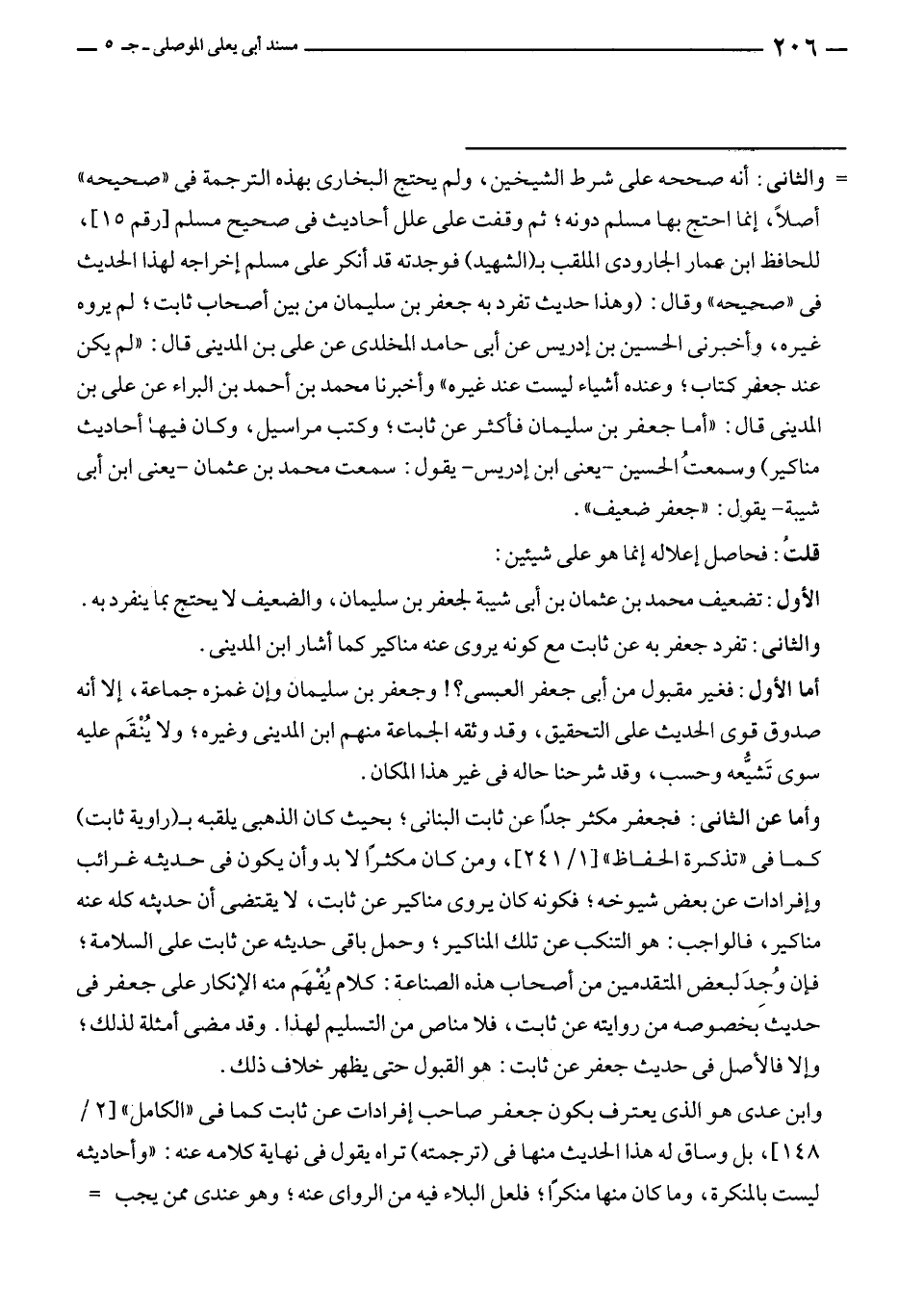 وأما عن الثاني: فجعفر مكثر جدًّا عن ثابت البنانى؛ بحيث كان الذهبى يلقبه بـ (راوية ثابت) كما في "تذكرة الحفاظ" [١/ ٢٤١]، ومن كان مكثرًا لا بد وأن يكون في حديثه غرائب وإفرادات عن بعض شيوخه؛ فكونه كان يروى مناكير عن ثابت، لا يقتضى أن حديثه كله عنه مناكير، فالواجب: هو التنكب عن تلك المناكير؛ وحمل باقى حديثه عن ثابت على السلامة؛ فإن وُجِدَ لبعض المتقدمين من أصحاب هذه الصناعة: كلام يُفْهَم منه الإنكار على جعفر في حديث بخصوصه من روايته عن ثابت، فلا مناص من التسليم لهذا. وقد مضى أمثلة لذلك؛ وإلا فالأصل في حديث جعفر عن ثابت: هو القبول حتى يظهر خلاف ذلك.