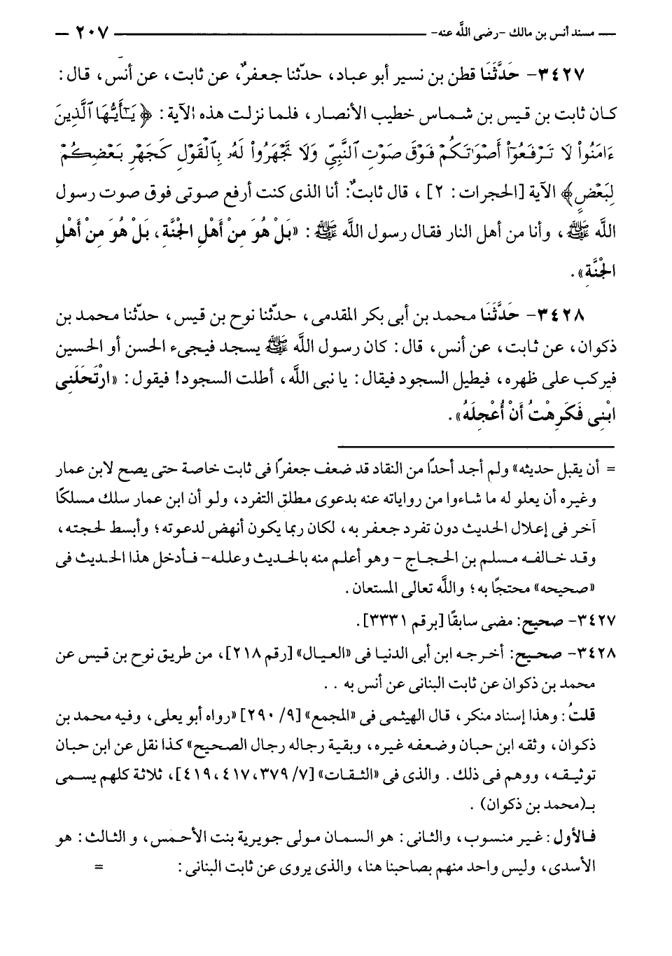 = أن يقبل حديثه" ولم أجد أحدًا من النقاد قد ضعف جعفرًا في ثابت خاصة حتى يصح لابن عمار وغيره أن يعلو له ما شاءوا من رواياته عنه بدعوى مطلق التفرد، ولو أن ابن عمار سلك مسلكًا آخر في إعلال الحديث دون تفرد جعفر به، لكان ربما يكون أنهض لدعوته؛ وأبسط لحجته، وقد خالفه مسلم بن الحجاج - وهو أعلم منه بالحديث وعلله - فأدخل هذا الحديث في "صحيحه" محتجَّا به؛ واللَّه تعالى المستعان.