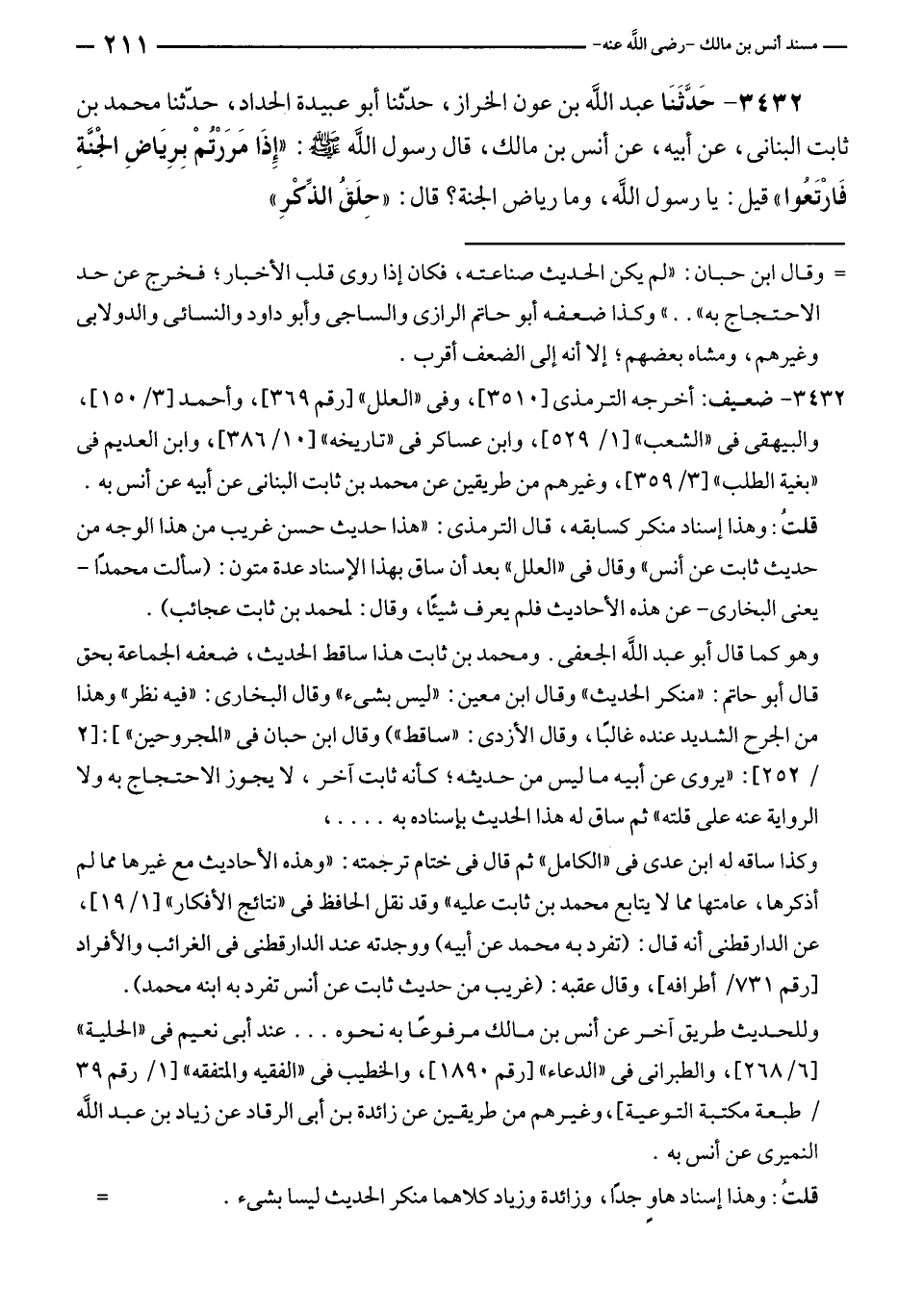 ٣٤٣٢ - حَدَّثَنَا عبد الله بن عون الخراز، حدّثنا أبو عبيدة الحداد، حدّثنا محمد بن ثابت البنانى، عن أبيه، عن أنس بن مالك، قال رسول الله - صلى الله عليه وسلم -: "إذَا مَرَرْتُمْ بِرِيَاضِ الجَنَّةِ فَارْتَعُوا" قيل: يا رسول الله، وما رياض الجنة؟ قال: "حِلَق الذِّكْرِ"