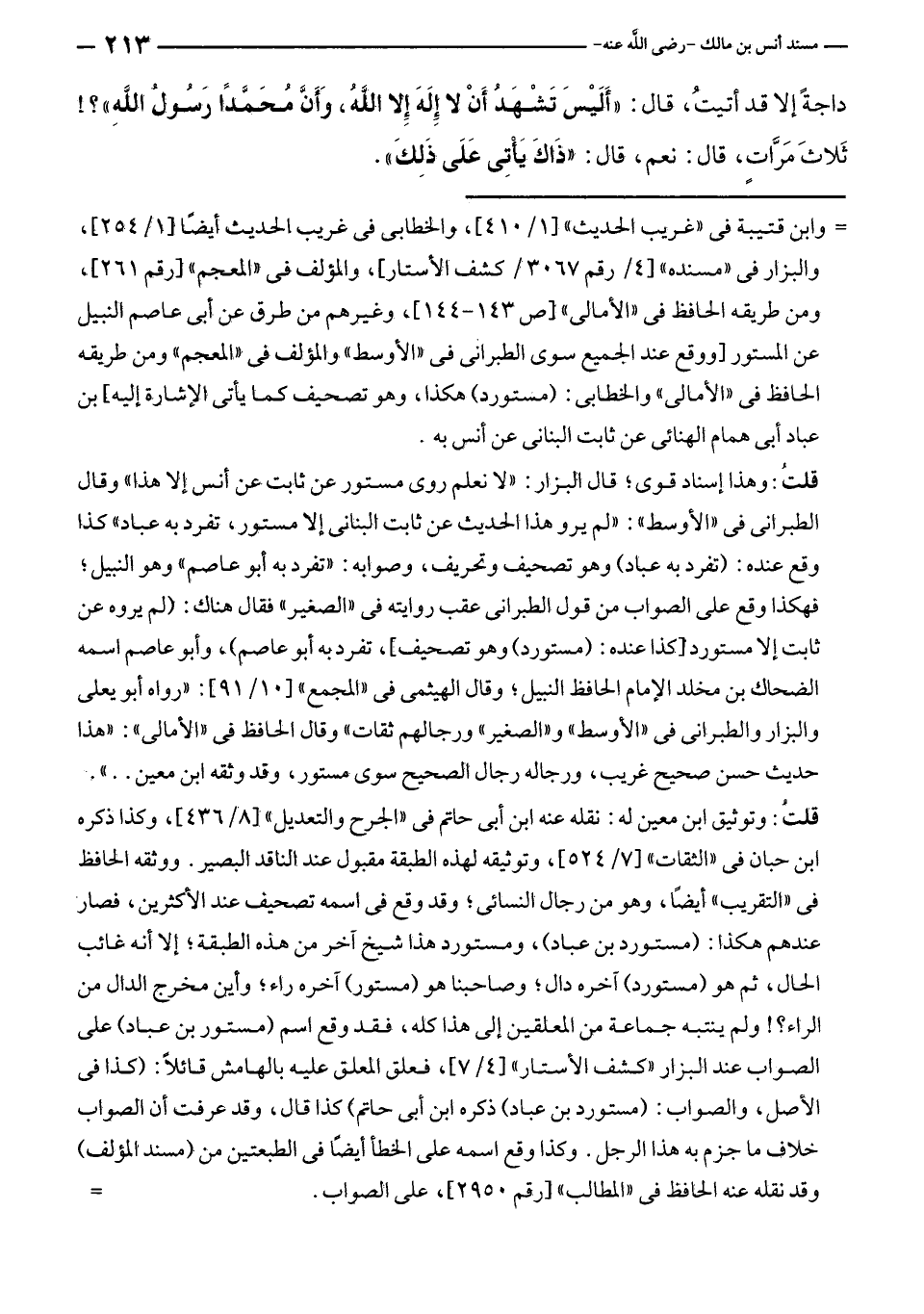 قلتُ: وهذا إسناد قوى؛ قال البزار: "لا نعلم روى مستور عن ثابت عن أنس إلا هذا" وقال الطبراني في "الأوسط": "لم يرو هذا الحديث عن ثابت البنانى إلا مستور، تفرد به عباد" كذا وقع عنده: (تفرد به عباد) وهو تصحيف وتحريف، وصوابه: "تفرد به أبو عاصم" وهو النبيل؛ فهكذا وقع على الصواب من قول الطبراني عقب روايته في "الصغير" فقال هناك: (لم يروه عن ثابت إلا مستورد [كذا عنده: (مستورد) وهو تصحيف]، تفرد به أبو عاصم)، وأبو عاصم اسمه الضحاك بن مخلد الإمام الحافظ النبيل؛ وقال الهيثمى في "المجمع" [١٠/ ١٩]: "رواه أبو يعلى والبزار والطبرانى في "الأوسط" و"الصغير" ورجالهم ثقات" وقال الحافظ في "الأمالى": "هذا حديث حسن صحيح غريب، ورجاله رجال الصحيح سوى مستور، وقد وثقه ابن معين .. ".