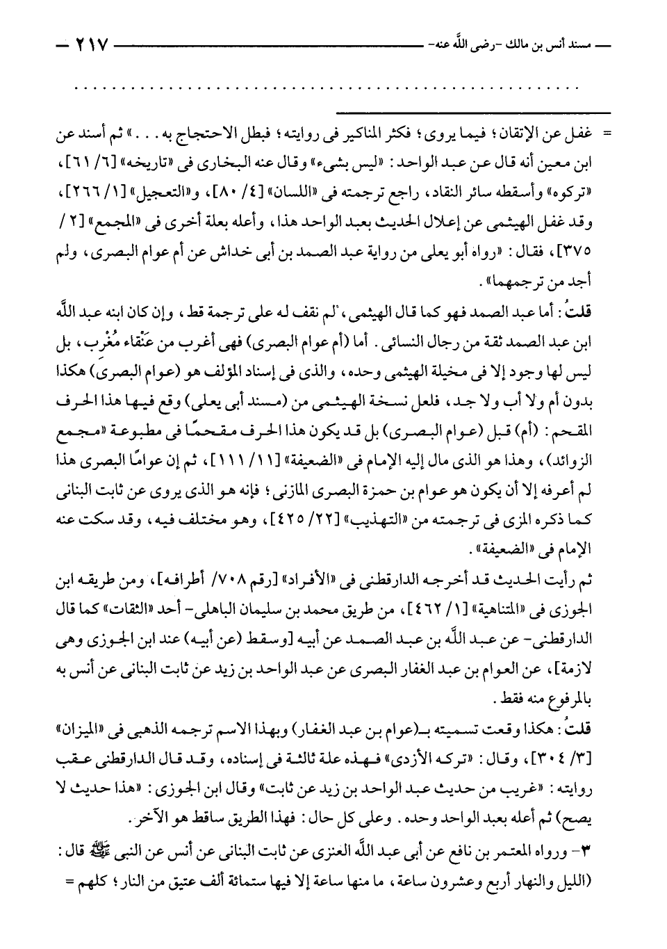 قلتُ: أما عبد الصمد فهو كما قال الهيثمى، لم نقف له على ترجمة قط، وإن كان ابنه عبد الله بن عبد الصمد ثقة من رجال النسائي. أما (أم عوام البصرى) فهى أغرب من عَنْقاء مُغْرِب، بل ليس لها وجود إلا في مخيلة الهيثمى وحده، والذى في إسناد المؤلف هو (عوام البصرى) هكذا بدون أم ولا أب ولا جد، فلعل نسخة الهيثمى من (مسند أبى يعلى) وقع فيها هذا الحرف المقحم: (أم) قبل (عوام البصرى) بل قد يكون هذا الحرف مقحمًا في مطبوعة "مجمع الزوائد)، وهذا هو الذي مال إليه الإمام في "الضعيفة" [١١/ ١١١]، ثم إن عوامًا البصرى هذا لم أعرفه إلا أن يكون هو عوام بن حمزة البصرى المازنى؛ فإنه هو الذي يروى عن ثابت البنانى كما ذكره المزى في ترجمته من "التهذيب" [٢٢/ ٤٢٥]، وهو مختلف فيه، وقد سكت عنه الإمام في "الضعيفة".