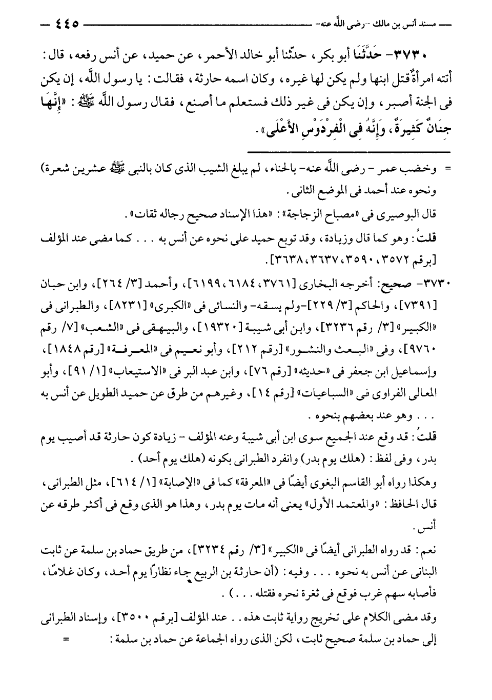 ٣٧٣٠ - حَدَّثَنَا أبو بكر، حدّثنا أبو خالد الأحمر، عن حميد، عن أنس رفعه، قال: أتته امرأةٌ قتل ابنها ولم يكن لها غيره، وكان اسمه حارثة، فقالت: يا رسول الله، إن يكن في الجنة أصبر، وإن يكن في غير ذلك فستعلم ما أصنع، فقال رسول الله - صلى الله عليه وسلم -: "إنَّهَا جِنَانٌ كَثِيرَةٌ، وَإنَّهُ فِي الْفِرْدَوْس الأَعْلَى".