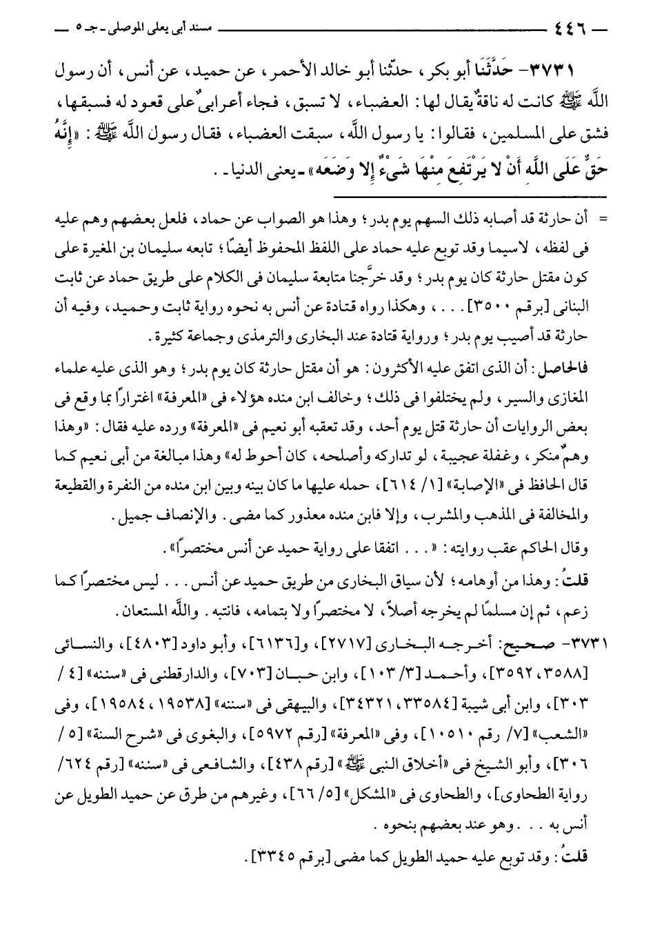 = أن حارثة قد أصابه ذلك السهم يوم بدر؛ وهذا هو الصواب عن حماد، فلعل بعضهم وهم عليه في لفظه، لاسيما وقد توبع عليه حماد على اللفظ المحفوظ أيضًا؛ تابعه سليمان بن المغيرة على كون مقتل حارثة كان يوم بدر؛ وقد خرَّجنا متابعة سليمان في الكلام على طريق حماد عن ثابت البنانى [برقم ٣٥٠٠] ... ، وهكذا رواه قتادة عن أنس به نحوه رواية ثابت وحميد، وفيه أن حارثة قد أصيب يوم بدر؛ ورواية قتادة عند البخارى والترمذى وجماعة كثيرة.