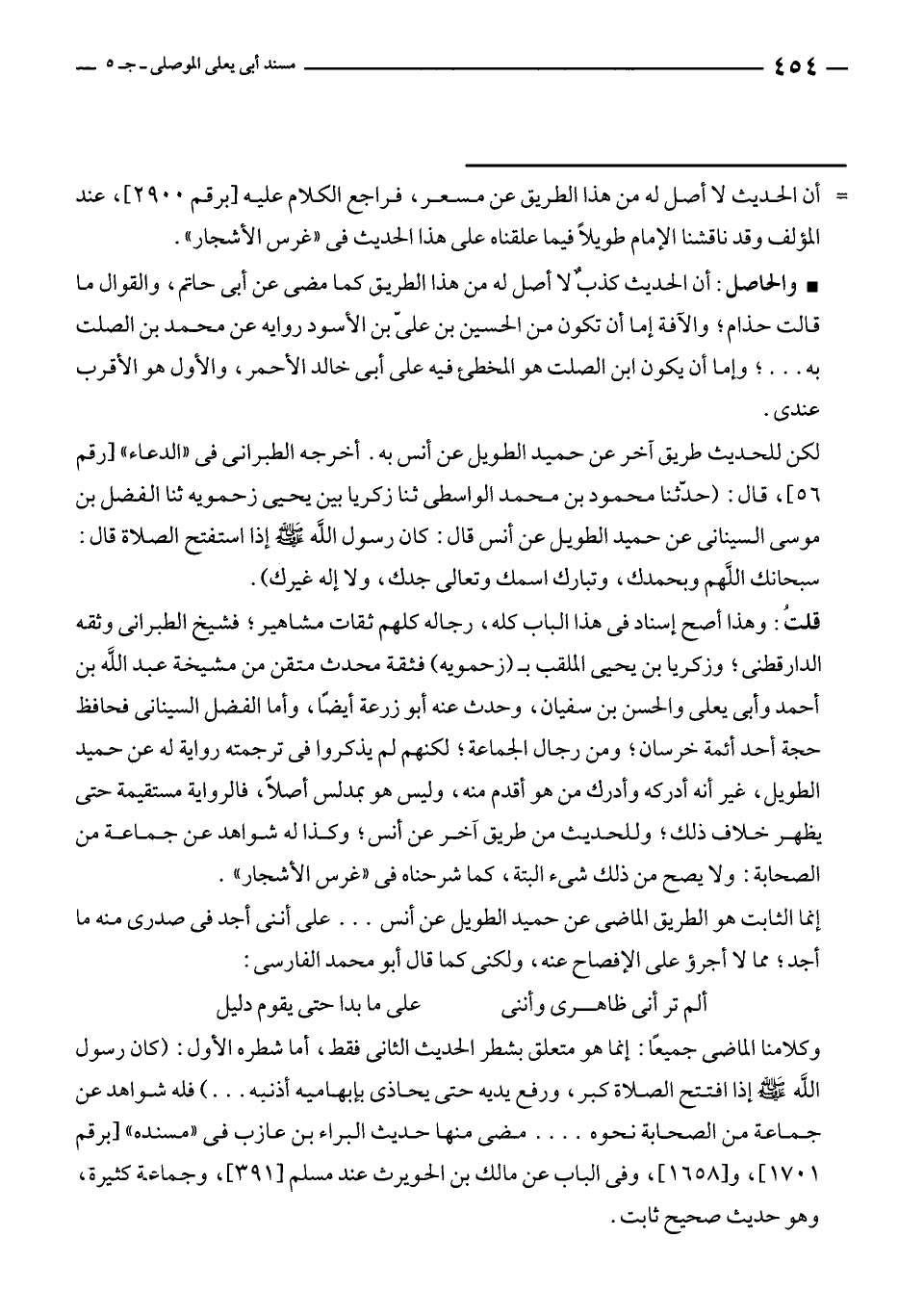 إنما الثابت هو الطريق الماضى عن حميد الطويل عن أنس ... على أننى أجد في صدرى منه ما أجد؛ مما لا أجرؤ على الإفصاح عنه، ولكنى كما قال أبو محمد الفارسى: