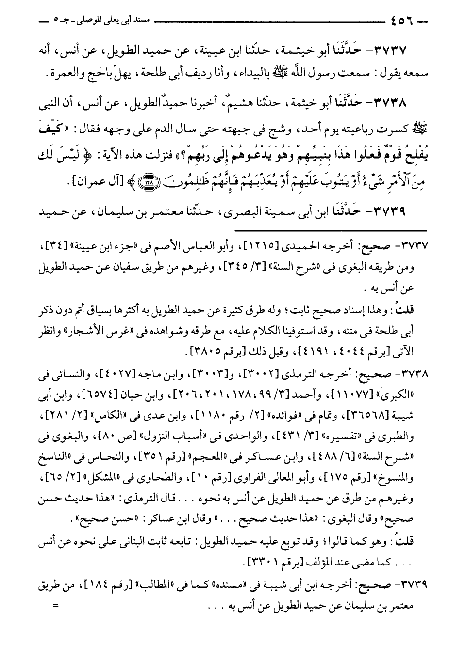 ٣٧٣٨ - صحيح: أخرجه الترمذى [٣٠٠٢]، و [٣٠٥٣]، وابن ماجه [٤٠٢٧]، والنسائى في "الكبرى" [١١٠٧٧]، وأحمد [٣/ ٩٩، ١٧٨، ٢٠١، ٢٠٦]، وابن حبان [٦٥٧٤]، وابن أبى شيبة [٣٦٥٦٨]، وتمام في "فوائده [٢/ رقم ١١٨٠]، وابن عدى في "الكامل" [٢/ ٢٨١]، والطبرى في "تفسيره" [٣/ ٤٣١]، والواحدى في "أسباب النزول" [ص ٨٠]، والبغوى في "شرح السنة" [٦/ ٤٨٨]، وابن عساكر في "المعجم" [رقم ٣٥١]، والنحاس في "الناسخ والمنسوخ" [رقم ١٧٥]، وأبو المعالى الفراوى [رقم ١٠]، والطحاوى في "المشكل" [٢/ ٦٥]، وغيرهم من طرق عن حميد الطويل عن أنس به نحوه ... قال الترمذى: "هذا حديث حسن صحيح" وقال البغوى: "هذا حديث صحيح ... " وقال ابن عساكر: "حسن صحيح".