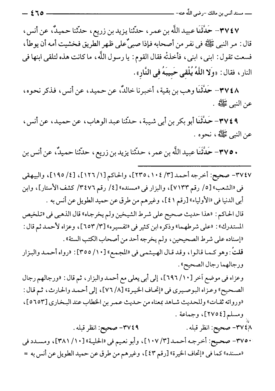 ٣٧٤٧ - حَدَّثَنَا عبيد الله بن عمر، حدّثنا يزيد بن زريع، حدّثنا حميدٌ، عن أنس، قال: مر النبي - صلى الله عليه وسلم - في نفر من أصحابه فإذا صبىٌ على ظهر الطريق فخشيت أمه أن يوطأ، فسعت تقول: ابنى، ابنى، فأخذتْه فقال القوم: يا رسول الله، ما كانت هذه لتلقى ابنها في النار، فقال: "وَلَا اللهُ يُلْقِى حَبِيبَهُ فِي النَّارِ".
