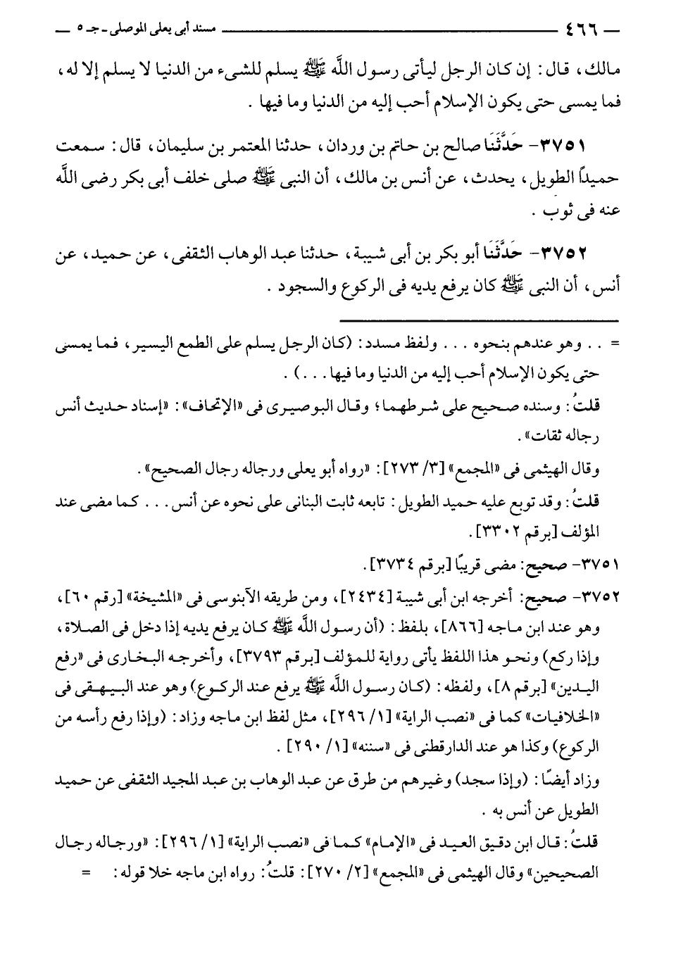 ٣٧٥٢ - حَدَّثَنَا أبو بكر بن أبى شيبة، حدثنا عبد الوهاب الثقفى، عن حميد، عن أنس، أن النبي - صلى الله عليه وسلم - كان يرفع يديه في الركوع والسجود.