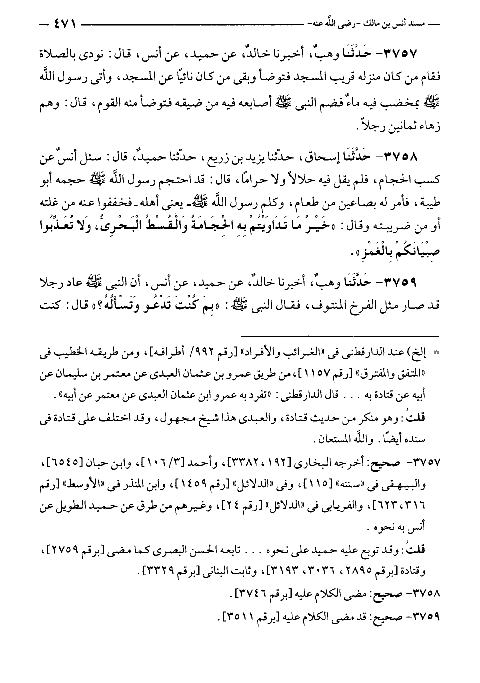 قلتُ: وقد توبع عليه حميد على نحوه ... تابعه الحسن البصرى كما مضى [برقم ٢٧٥٩]، وقتادة [برقم ٢٨٩٥، ٣٠٣٦، ٣١٩٣]، وثابت البنانى [برقم ٣٣٢٩].