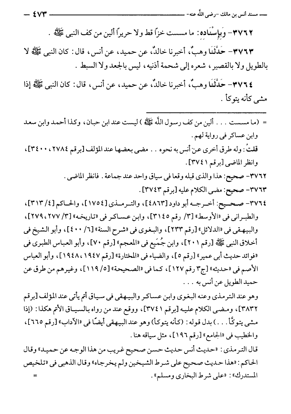 ٣٧٦٤ - حَدَّثَنَا وهبٌ، أخبرنا خالد، عن حميد، عن أنس، قال: كان النبي - صلى الله عليه وسلم - إذا مشى كأنه يتوكأ.