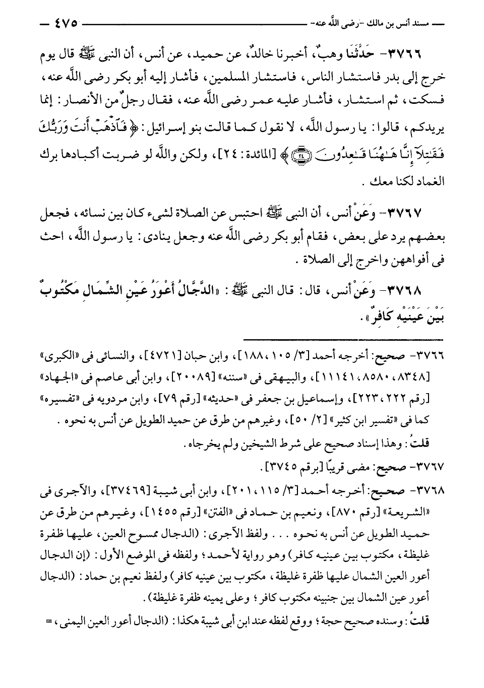 ٣٧٦٨ - صحيح: أخرجه أحمد [٣/ ١١٥، ٢٠١]، وابن أبى شيبة [٣٧٤٦٩]، والآجرى في "الشريعة" [رقم ٨٧٠]، ونعيم بن حماد في "الفتن" [رقم ١٤٥٥]، وغيرهم من طرق عن حميد الطويل عن أنس به نحوه ... ولفظ الآجرى: (الدجال ممسوح العين، عليها ظفرة غليظة، مكتوب بين عينيه كافر) وهو رواية لأحمد؛ ولفظه في الموضع الأول: (إن الدجال أعور العين الشمال عليها ظفرة غليظة، مكتوب بين عينيه كافر) ولفظ نعيم بن حماد: (الدجال أعور عين الشمال بين جنبينه مكتوب كافر؛ وعلى يمينه ظفرة غليظة).