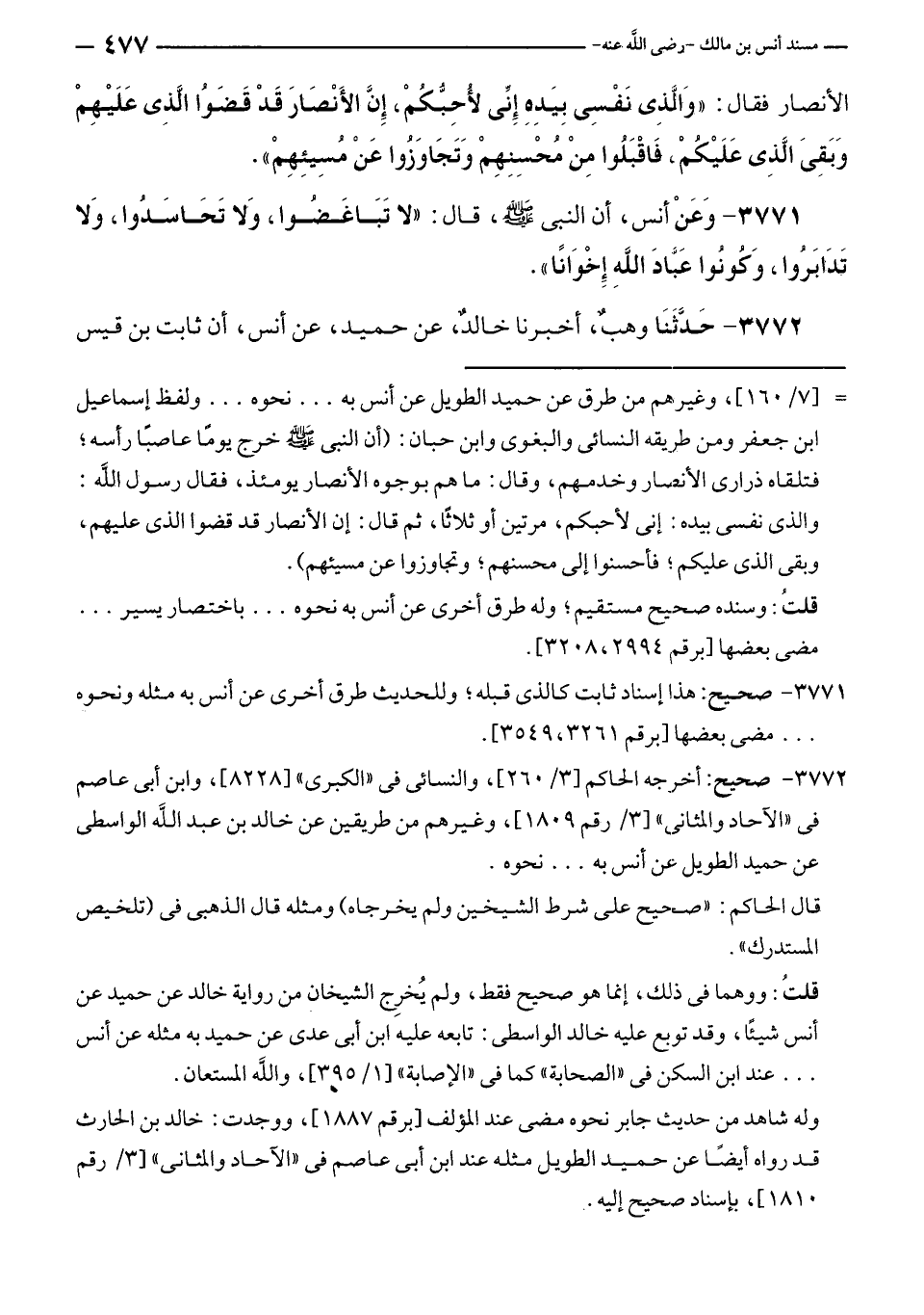 ٣٧٧١ - صحيح: هذا إسناد ثابت كالذى قبله؛ وللحديث طرق أخرى عن أنس به مثله ونحوه ... مضى بعضها [برقم ٣٥٤٩،٣٢٦١].
