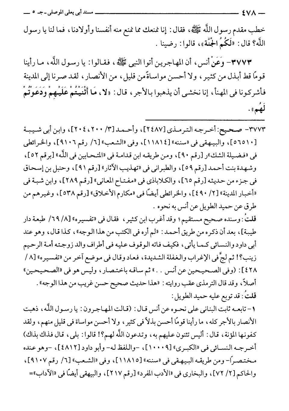١ - تابعه ثابت البنانى على نحوه عن أنس قال: (قالت المهاجرون: يا رسول الله، ذهبت الأنصار بالأجر كله، ما رأينا قومًا أحسن بذلًا في كثير، ولا أحسن مواساة في قليل منهم، ولقد كفونها المؤنة، قال: أليس تثنون عليهم به، وتدعون الله لهم؟! قالوا: بلى، قال فذاك بذاك) أخرجه النسائي في "الكبرى" [١٠٠٠٩]، - واللفظ له - وأبو داود [٤٨١٢]، - وهو عنده مختصرًا - ومن طريقه البيهقى في "سننه" [١١٨١٥]، وفى "الشعب" [٦/ رقم ٩١٠٧]، والحاكم [٢/ ٧٢]، والبخارى في "الأدب المفرد" [رقم ٢١٧]، والبيهقى أيضًا في "الآداب" =