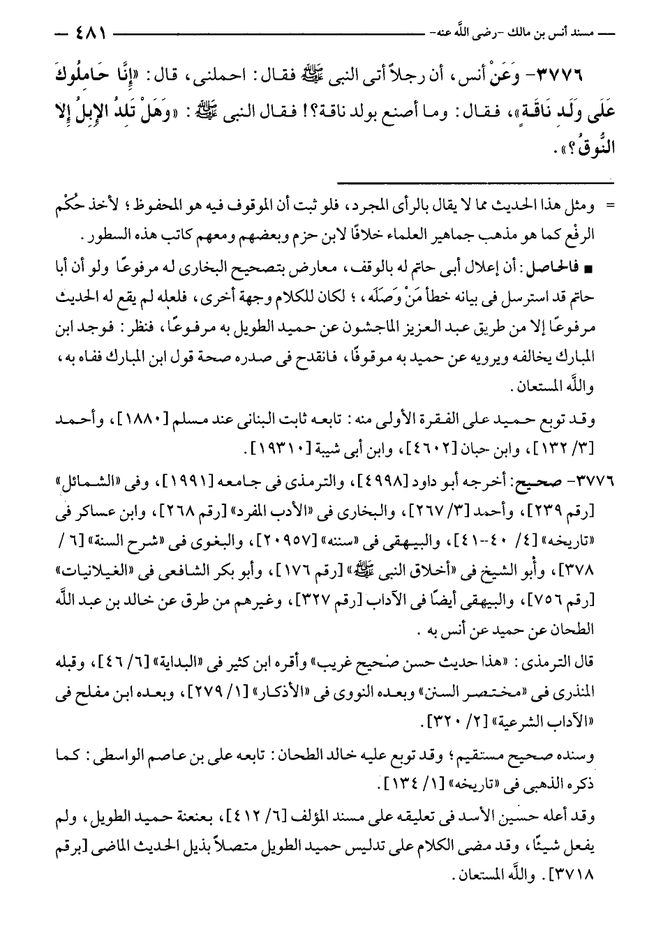 ٣٧٧٦ - وَعَنْ أنس، أن رجلًا أتى النبي - صلى الله عليه وسلم - فقال: احملنى، قال: "إنَّا حَامِلُوكَ عَلَى وَلَدِ نَاقَةٍ"، فقال: وما أصنع بولد ناقة؟! فقال النبي - صلى الله عليه وسلم -: "وَهَلْ تَلِدُ الإِبِلُ إِلا النُّوقُ؟ ".