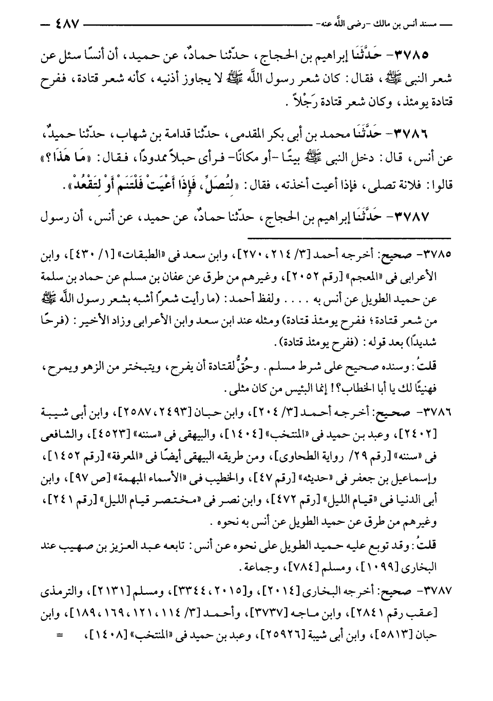 ٣٧٨٥ - صحيح: أخرجه أحمد [٣/ ٢١٤، ٢٧٠] , وابن سعد في "الطبقات" [١/ ٤٣٠]، وابن الأعرابى في "المعجم" [رقم ٢٠٥٢]، وغيرهم من طرق عن عفان بن مسلم عن حماد بن سلمة عن حميد الطويل عن أنس به .... ولفظ أحمد: (ما رأيت شعرًا أشبه بشعر رسول الله - صلى الله عليه وسلم - من شعر قتادة؟ ففرح يومئذ قتادة) ومثله عند ابن سعد وابن الأعرابى وزاد الأخير: (فرحًا شديدًا) بعد قوله: (ففرح يومئذ قتادة).