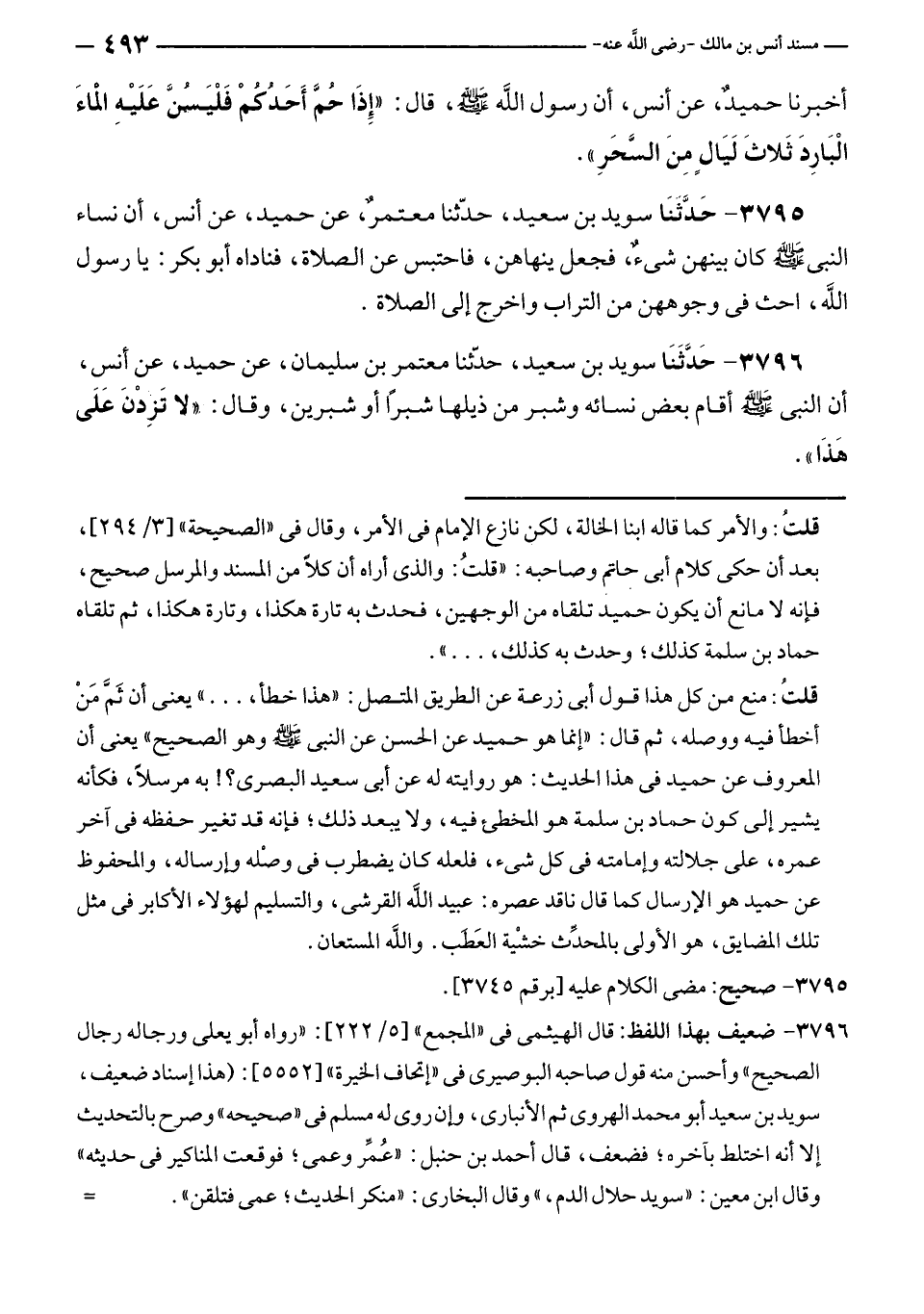 أخبرنا حميدٌ، عن أنس، أن رسول الله - صلى الله عليه وسلم -، قال: "إذَا حُمَّ أَحَدُكُمْ فَلْسنَّ عَلَيْهِ الْماءَ الْبَارِدَ ثَلاثَ لَيَالٍ مِنَ السَّحَرِ".